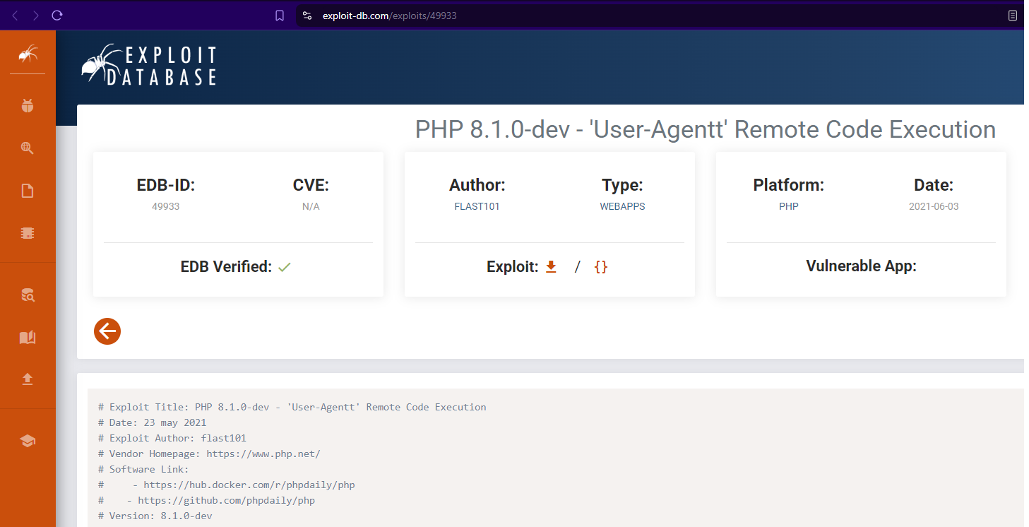 ┌──(kali㉿kali)-[~/Documents/htb/knife] └─$ wget https://www.exploit-db.com/raw/49933 -O exploit.py --2025-01-21 01:05:23-- https://www.exploit-db.com/raw/49933 Resolving www.exploit-db.com (www.exploit-db.com)... 192.124.249.13 Connecting to www.exploit-db.com (www.exploit-db.com)|192.124.249.13|:443... connected. HTTP request sent, awaiting response... 200 OK Length: 2040 (2.0K) [text/plain] Saving to: ‘exploit.py’ exploit.py 100%[========================================================================================================================================>] 1.99K --.-KB/s in 0s 2025-01-21 01:05:24 (59.1 MB/s) - ‘exploit.py’ saved [2040/2040]