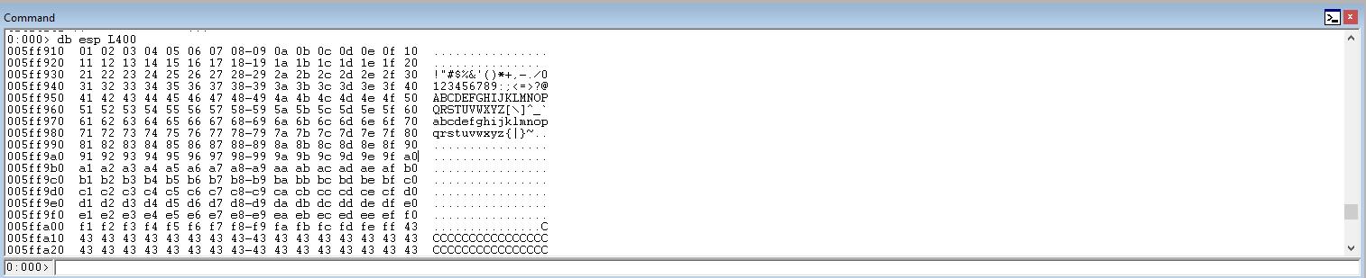 Run the code. Check the ESP register and check the characters in the payload. All the characters from the hex list should be in the ESP. If there is any drop off, remove that character, send the payload again, and repeat until all the characters appear in ESP.