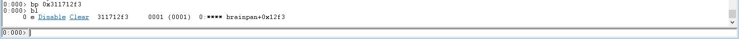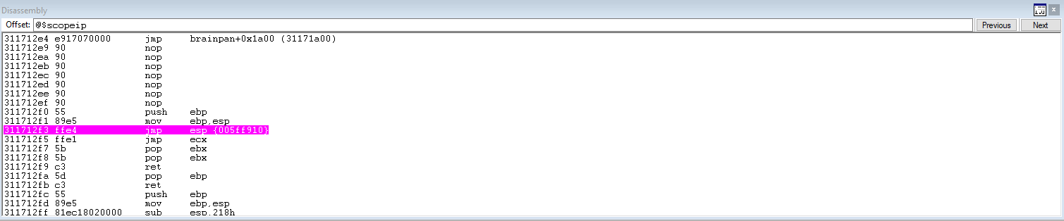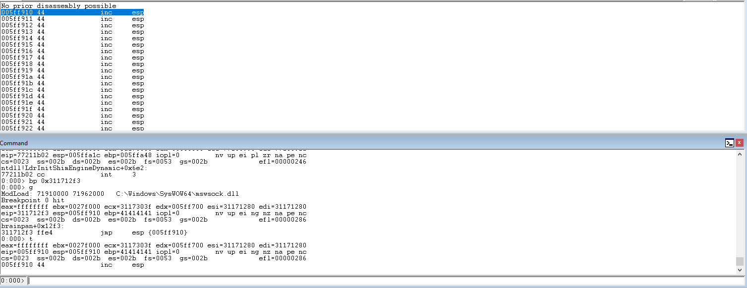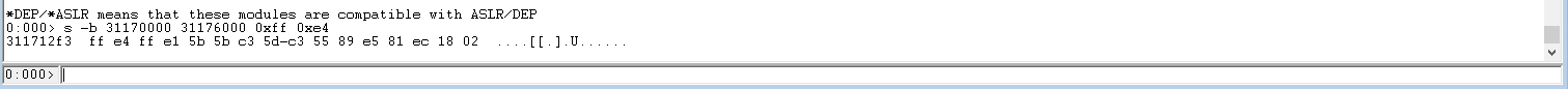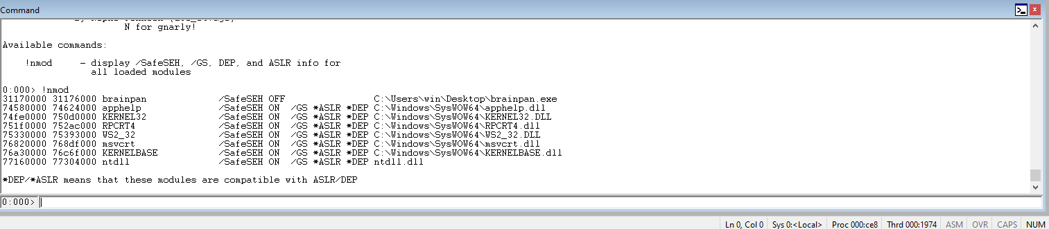Run the !nmod to load all of the various modules and their associated protections. Choose a module that does not have any bad chars in the address space, does not have DEP enabled, and does not have ASLR enabled. Preference is always given to modules that ship with the program due to portability. If a Windows module is chosen, the exploit is Windows version dependent. For this, note the brainpan.exe address range.