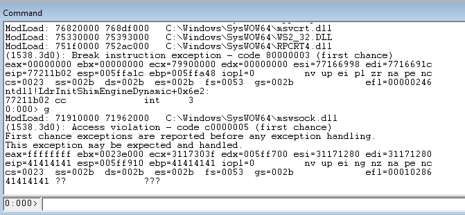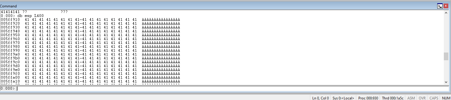 Check the EIP register in Windbg to ensure that the 41s overwrote the value in EIP.