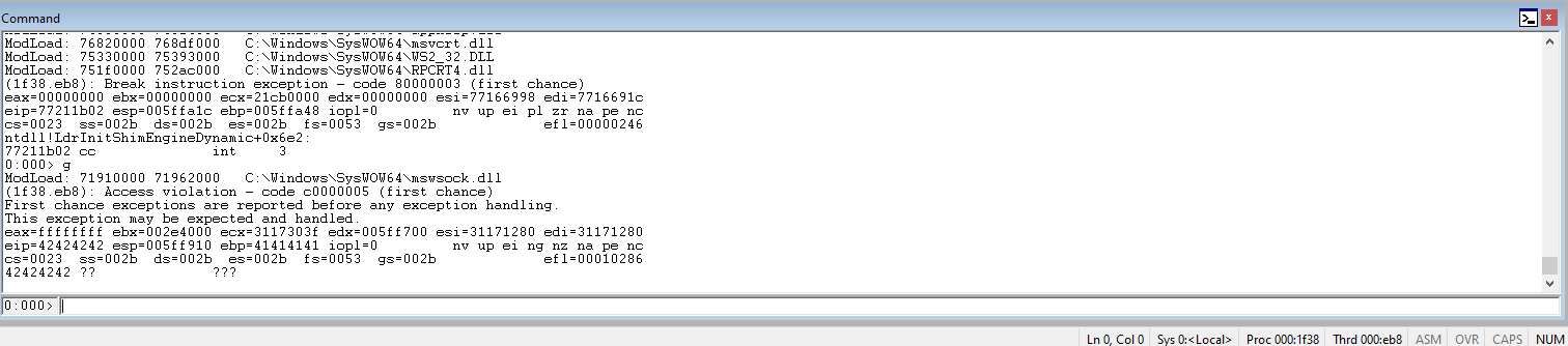 Run the code again. Check the EIP register and ensure that our 42s are in the EIP register.