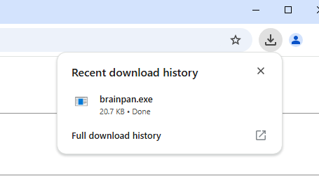 ┌──(sec㉿kali)-[~/Documents/thm/brainpan] └─$ wget http://10.10.157.16:10000/bin/brainpan.exe --2025-01-03 13:42:17-- http://10.10.157.16:10000/bin/brainpan.exe Connecting to 10.10.157.16:10000... connected. HTTP request sent, awaiting response... 200 OK Length: 21190 (21K) [application/x-msdos-program] Saving to: ‘brainpan.exe’ brainpan.exe 100%[========================================================================================================================================>] 20.69K 74.7KB/s in 0.3s 2025-01-03 13:42:18 (74.7 KB/s) - ‘brainpan.exe’ saved [21190/21190]
