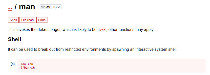 Now, that it is known that it calls the man command, lookup man on the gtfobins.