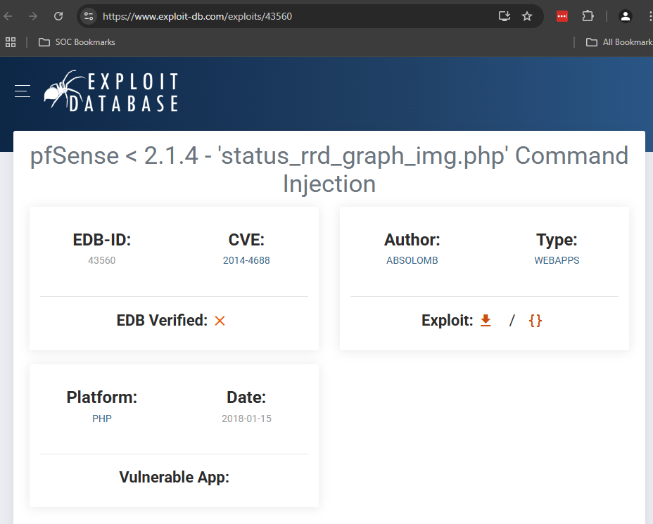 Search exploit-db looking for our version of pfsense. Looks like there is a command injection.