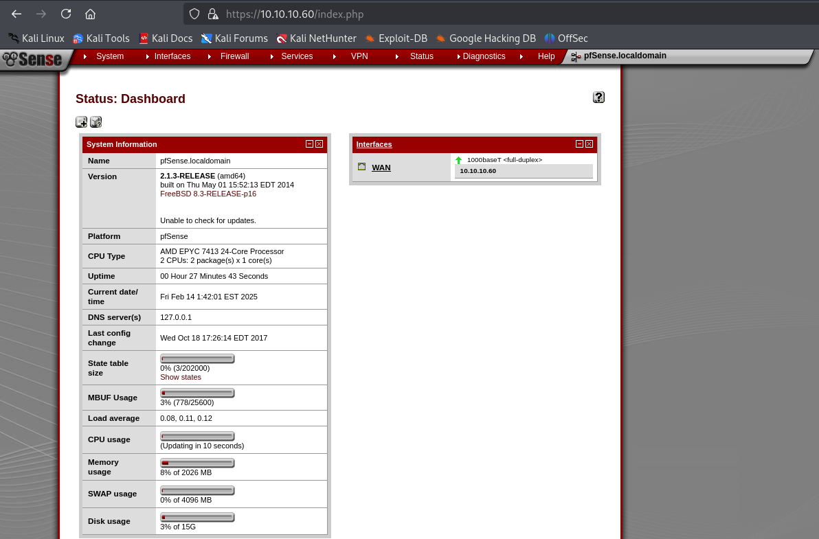 Login to the pfsense portal with rohit as the username and pfsense from the default installation docs. Note the version on the dashboard.