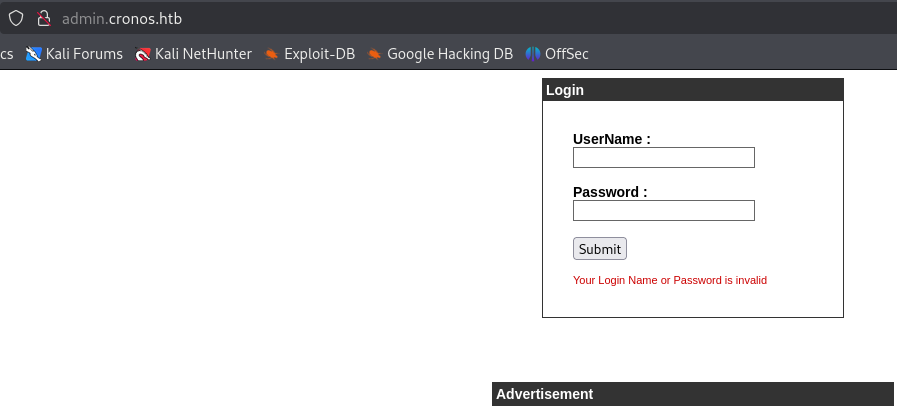 └─$ ffuf -w /usr/share/seclists/Discovery/Web-Content/directory-list-2.3-medium.txt -u http://cronos.htb/FUZZ -e .txt,.bak,.html,.php -fw 990