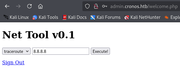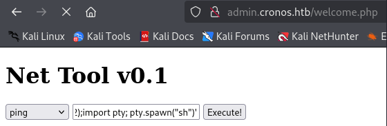 127.0.0.1 localhost 127.0.1.1 kali 10.10.10.13 cronos.htb www.cronos.htb admin.cronos.htb # The following lines are desirable for IPv6 capable hosts ::1 localhost ip6-localhost ip6-loopback ff02::1 ip6-allnodes ff02::2 ip6-allrouters