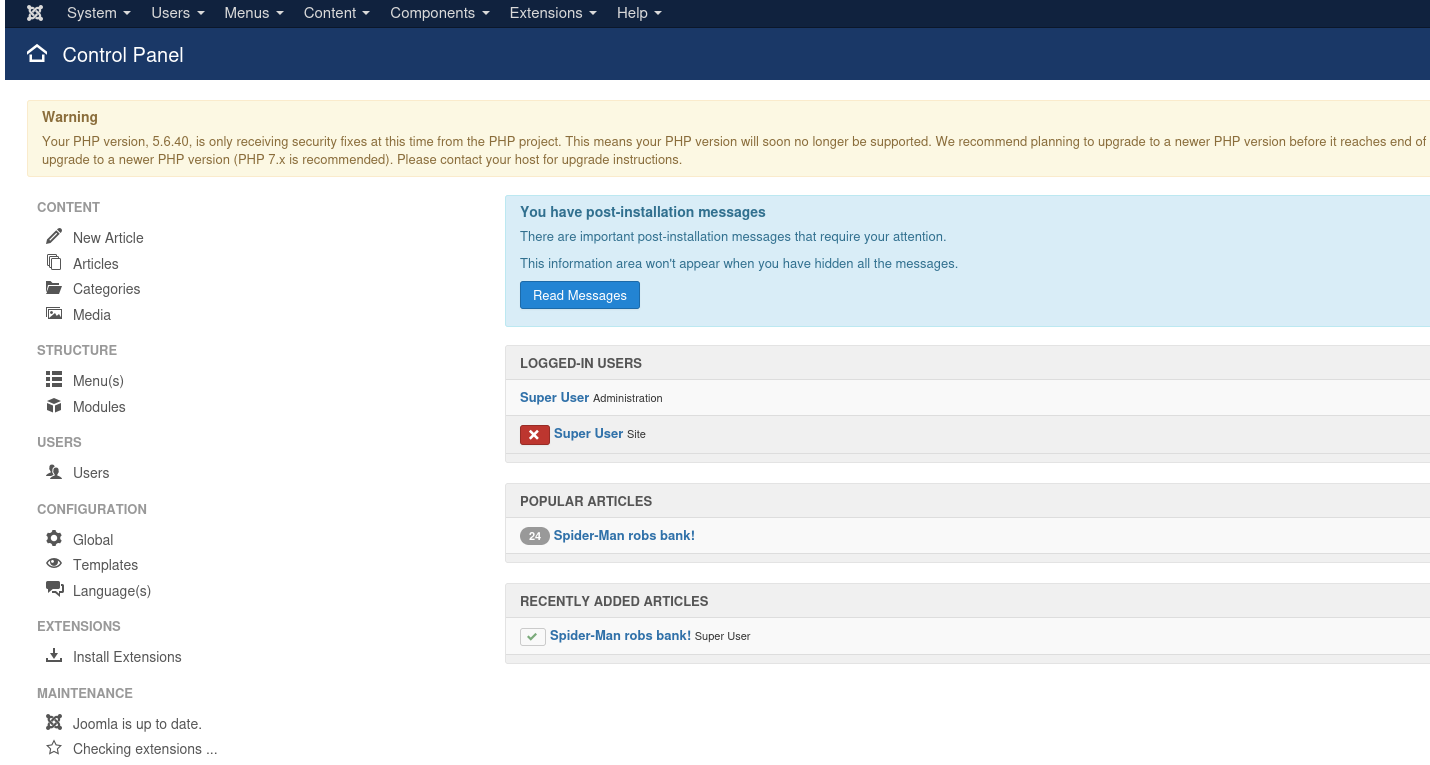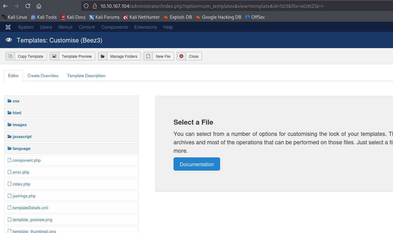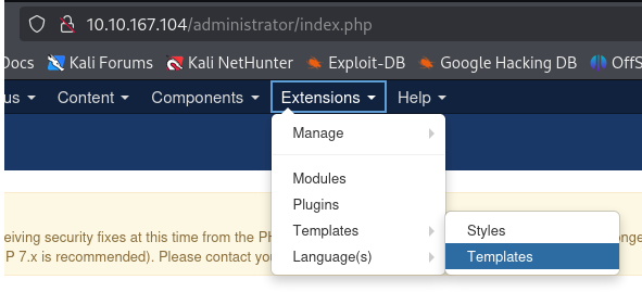 Perform more research about the vulnerabilities associated with Joomla. Apperently, we can abuse the template section. So from the Extensions menu, rollover Templates, and Select Templates.