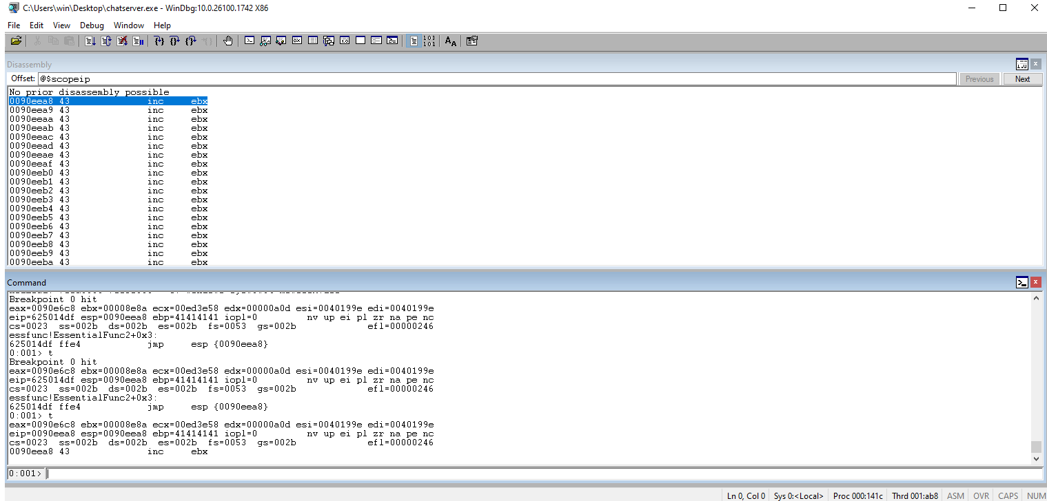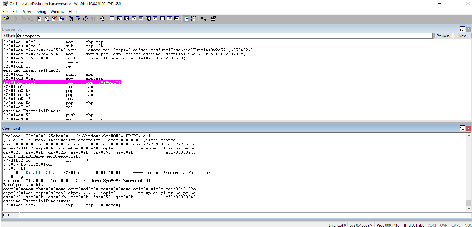 Check WinDbg and ensure that we caught the jmp ESP breakpoint.