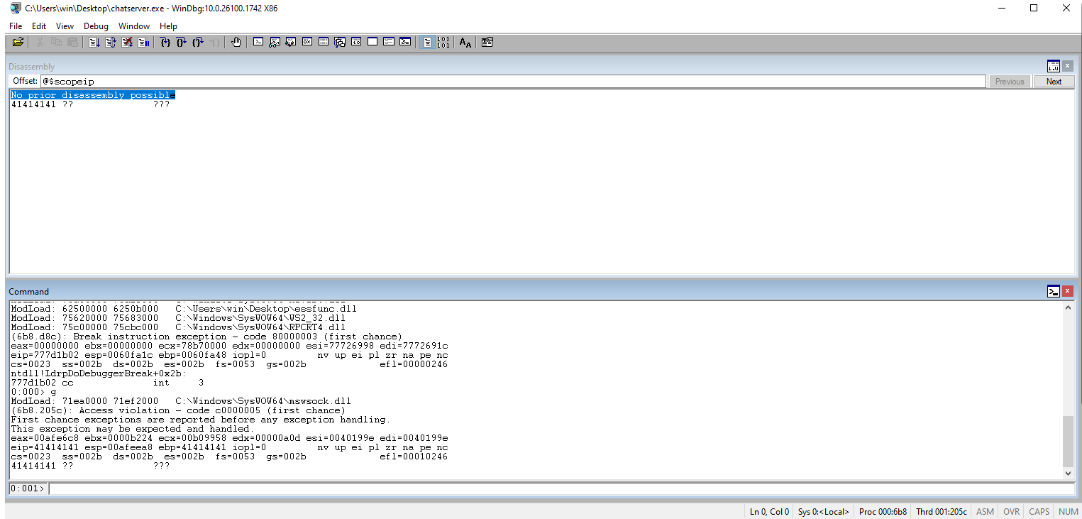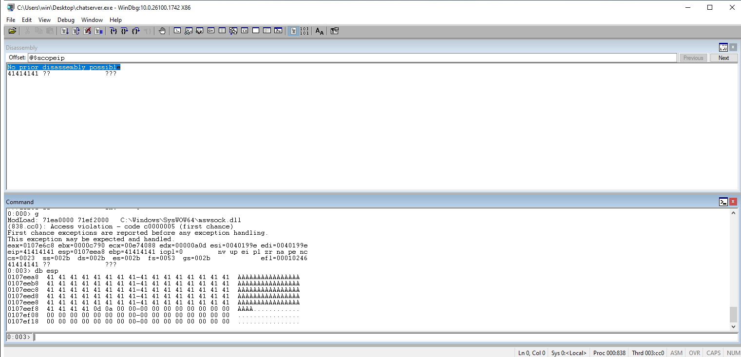 Check Windbg to ensure that our As (\x41s) overtake the EIP register.