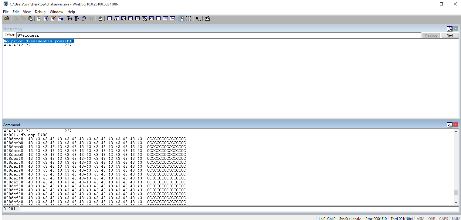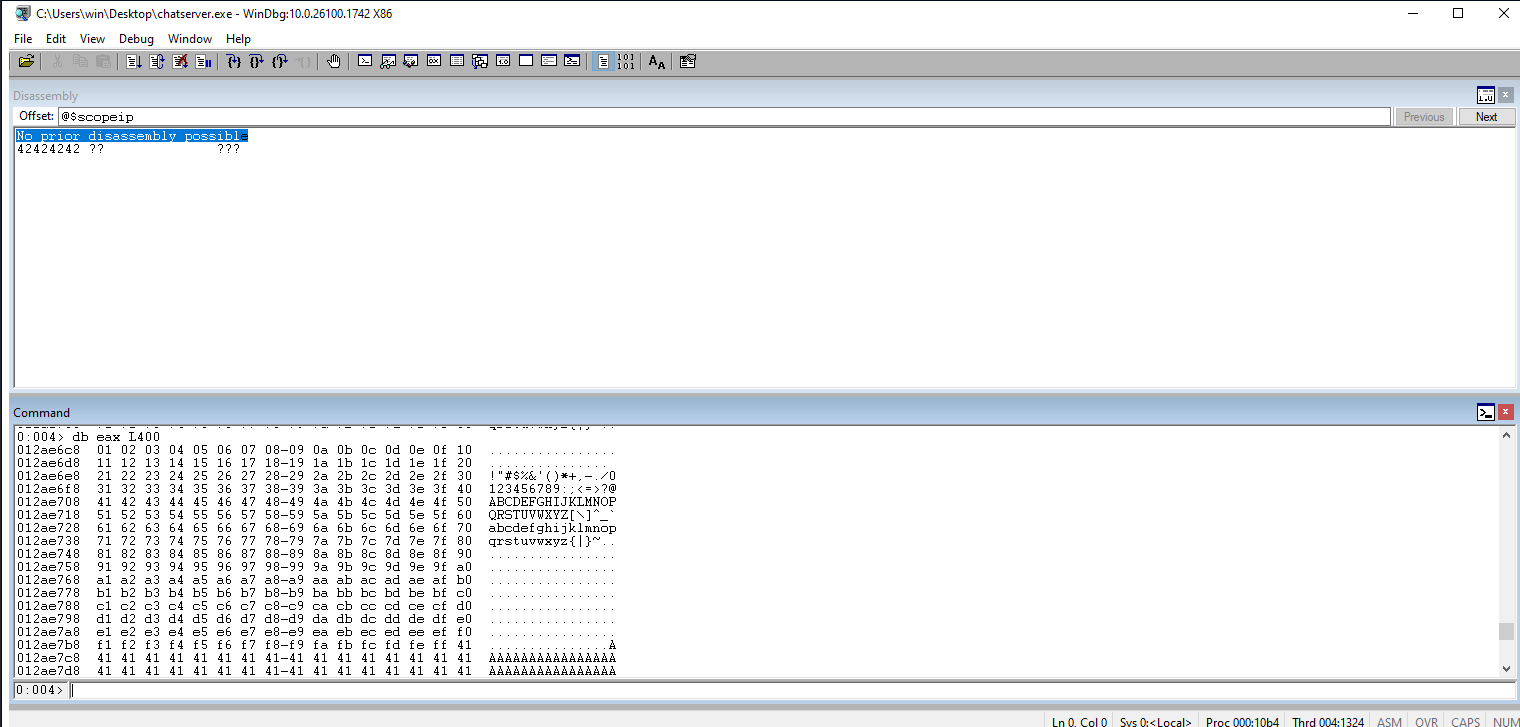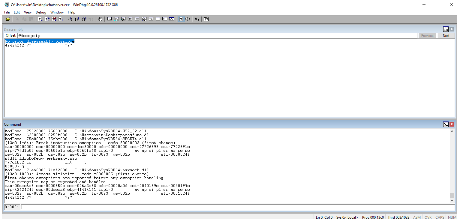 Check Windbg. We should see the Bs (42s) in the EIP register.