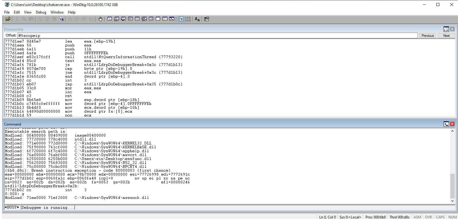 Reset WinDbg and set a break-point on the address that we chose.