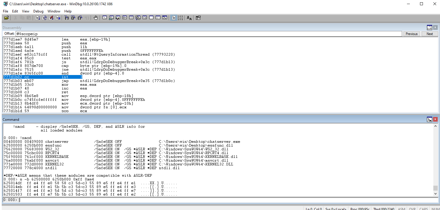 Use !nmod to get a list of the available modules. We are looking for a module that doesn’t have Address Space Layout Randomization (ASLR) and Data Execution Prevention (DEP) protections and no bad characters in the address range.
