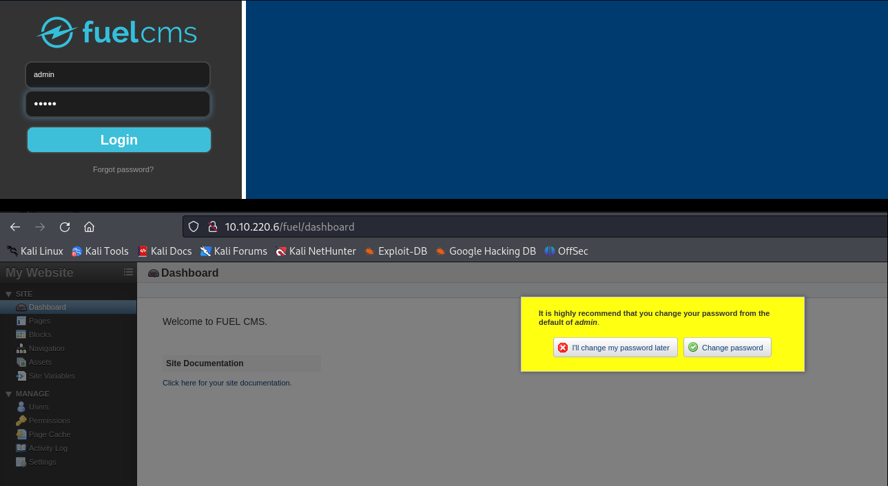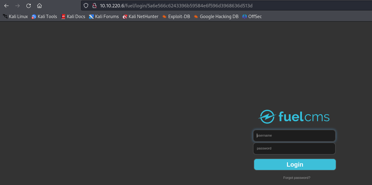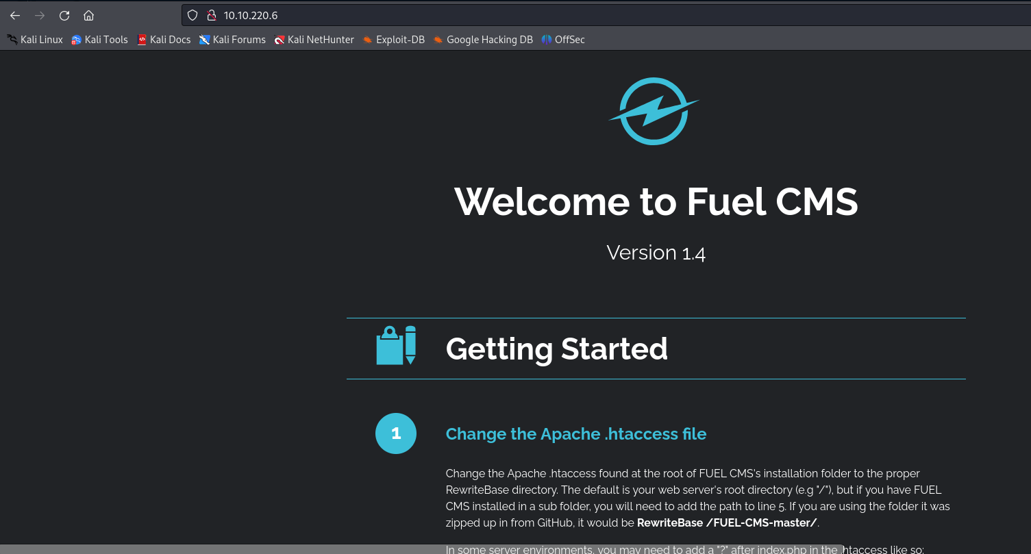 ┌──(kali㉿kali)-[~/Documents/thm/ignite] └─$ searchsploit fuel cms ---------------------------------------------------------------------------------------------------------------------------------------------------------------------------------------------------------- --------------------------------- Exploit Title | Path ---------------------------------------------------------------------------------------------------------------------------------------------------------------------------------------------------------- --------------------------------- fuel CMS 1.4.1 - Remote Code Execution (1) | linux/webapps/47138.py Fuel CMS 1.4.1 - Remote Code Execution (2) | php/webapps/49487.rb Fuel CMS 1.4.1 - Remote Code Execution (3) | php/webapps/50477.py Fuel CMS 1.4.13 - 'col' Blind SQL Injection (Authenticated) | php/webapps/50523.txt Fuel CMS 1.4.7 - 'col' SQL Injection (Authenticated) | php/webapps/48741.txt Fuel CMS 1.4.8 - 'fuel_replace_id' SQL Injection (Authenticated) | php/webapps/48778.txt Fuel CMS 1.5.0 - Cross-Site Request Forgery (CSRF) | php/webapps/50884.txt ---------------------------------------------------------------------------------------------------------------------------------------------------------------------------------------------------------- --------------------------------- Shellcodes: No Results