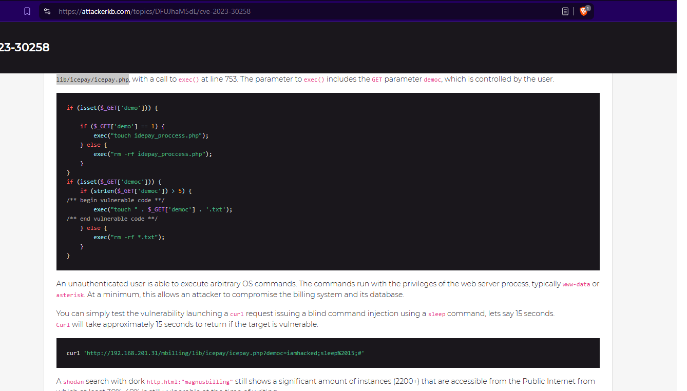 Check the Google machine for MagnusBilling from the splash screen. Discover CVE-2023-30258. It appears that lib/icepay/icepay.php has a parameter called democ that gets executed.