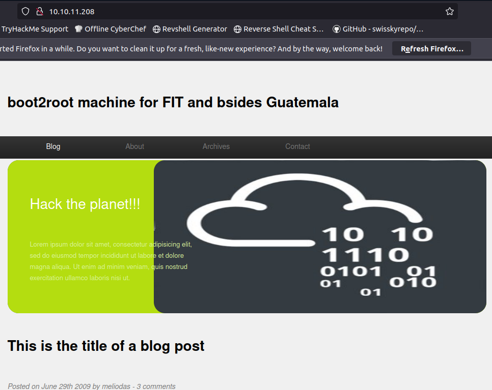root@ip-10-10-22-36:~# sudo nmap -sV -sC -O -A -oN nmap 10.10.11.208 Starting Nmap 7.80 ( https://nmap.org ) at 2025-03-10 11:31 GMT Nmap scan report for 10.10.11.208 Host is up (0.00045s latency). Not shown: 998 closed ports PORT STATE SERVICE VERSION 22/tcp open ssh OpenSSH 7.2p2 Ubuntu 4ubuntu2.8 (Ubuntu Linux; protocol 2.0) | ssh-hostkey: | 2048 c4:2f:c3:47:67:06:32:04:ef:92:91:8e:05:87:d5:dc (RSA) | 256 68:92:13:ec:94:79:dc:bb:77:02:da:99:bf:b6:9d:b0 (ECDSA) |_ 256 43:e8:24:fc:d8:b8:d3:aa:c2:48:08:97:51:dc:5b:7d (ED25519) 80/tcp open http Apache httpd 2.4.18 ((Ubuntu)) | http-robots.txt: 1 disallowed entry |_/ |_http-server-header: Apache/2.4.18 (Ubuntu) |_http-title: Welcome to Blog - Library Machine MAC Address: 02:50:6E:3C:E3:7D (Unknown) Device type: general purpose Running: Linux 3.X OS CPE: cpe:/o:linux:linux_kernel:3 OS details: Linux 3.10 - 3.13 Network Distance: 1 hop Service Info: OS: Linux; CPE: cpe:/o:linux:linux_kernel TRACEROUTE HOP RTT ADDRESS 1 0.45 ms 10.10.11.208 OS and Service detection performed. Please report any incorrect results at https://nmap.org/submit/ . Nmap done: 1 IP address (1 host up) scanned in 10.34 seconds