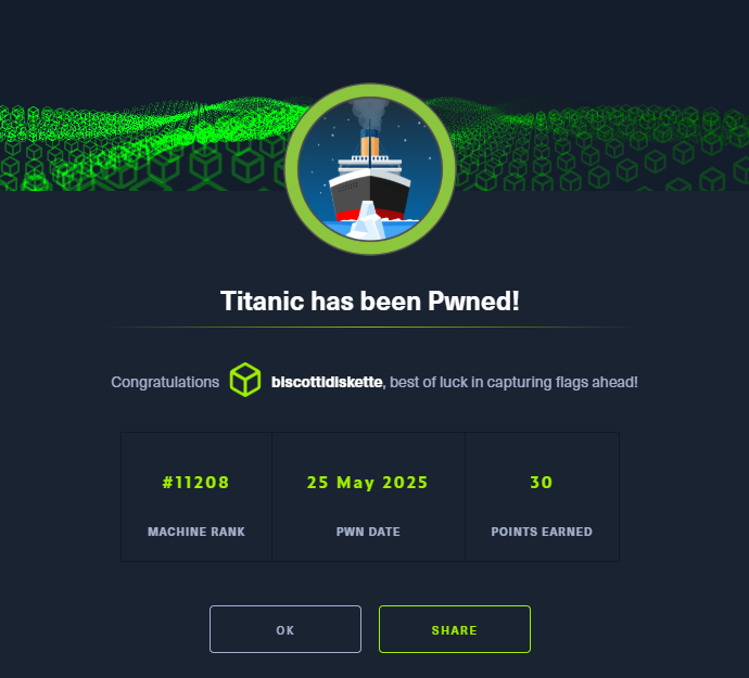 └──╼ [★]$ nmap -sC -sV -A -O -oN nmap 10.10.11.55 Starting Nmap 7.94SVN ( https://nmap.org ) at 2025-05-23 22:30 CDT Nmap scan report for 10.10.11.55 Host is up (0.20s latency). Not shown: 998 closed tcp ports (reset) PORT STATE SERVICE VERSION 22/tcp open ssh OpenSSH 8.9p1 Ubuntu 3ubuntu0.10 (Ubuntu Linux; protocol 2.0) | ssh-hostkey: | 256 73:03:9c:76:eb:04:f1:fe:c9:e9:80:44:9c:7f:13:46 (ECDSA) |_ 256 d5:bd:1d:5e:9a:86:1c:eb:88:63:4d:5f:88:4b:7e:04 (ED25519) 80/tcp open http Apache httpd 2.4.52 |_http-title: Did not follow redirect to http://titanic.htb/ |_http-server-header: Apache/2.4.52 (Ubuntu) No exact OS matches for host (If you know what OS is running on it, see https://nmap.org/submit/ ).
