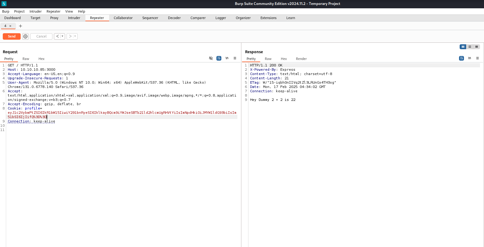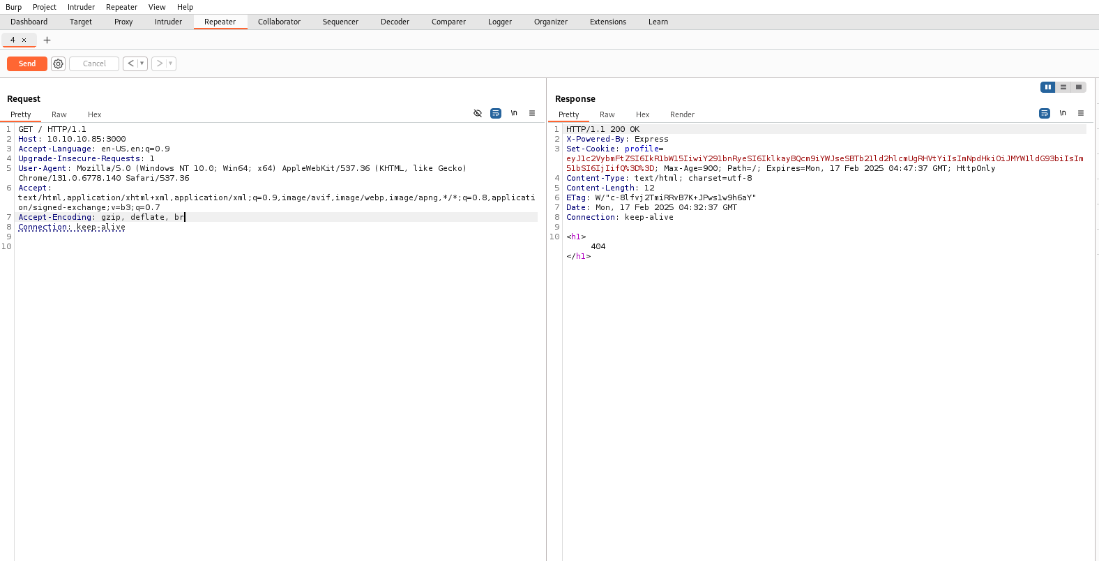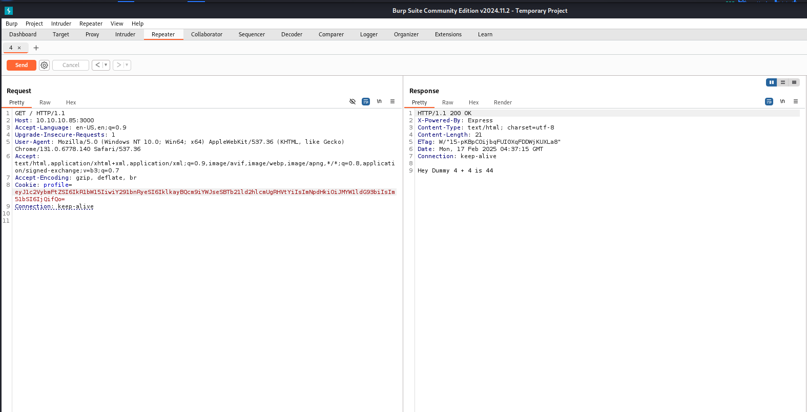┌──(kali㉿kali)-[~/Documents/htb/celestial] └─$ curl -I http://10.10.10.85:3000 HTTP/1.1 200 OK X-Powered-By: Express Set-Cookie: profile=eyJ1c2VybmFtZSI6IkR1bW15IiwiY291bnRyeSI6IklkayBQcm9iYWJseSBTb21ld2hlcmUgRHVtYiIsImNpdHkiOiJMYW1ldG93biIsIm51bSI6IjIifQ%3D%3D; Max-Age=900; Path=/; Expires=Mon, 17 Feb 2025 03:41:13 GMT; HttpOnly Content-Type: text/html; charset=utf-8 Content-Length: 12 ETag: W/"c-8lfvj2TmiRRvB7K+JPws1w9h6aY" Date: Mon, 17 Feb 2025 03:26:13 GMT Connection: keep-alive