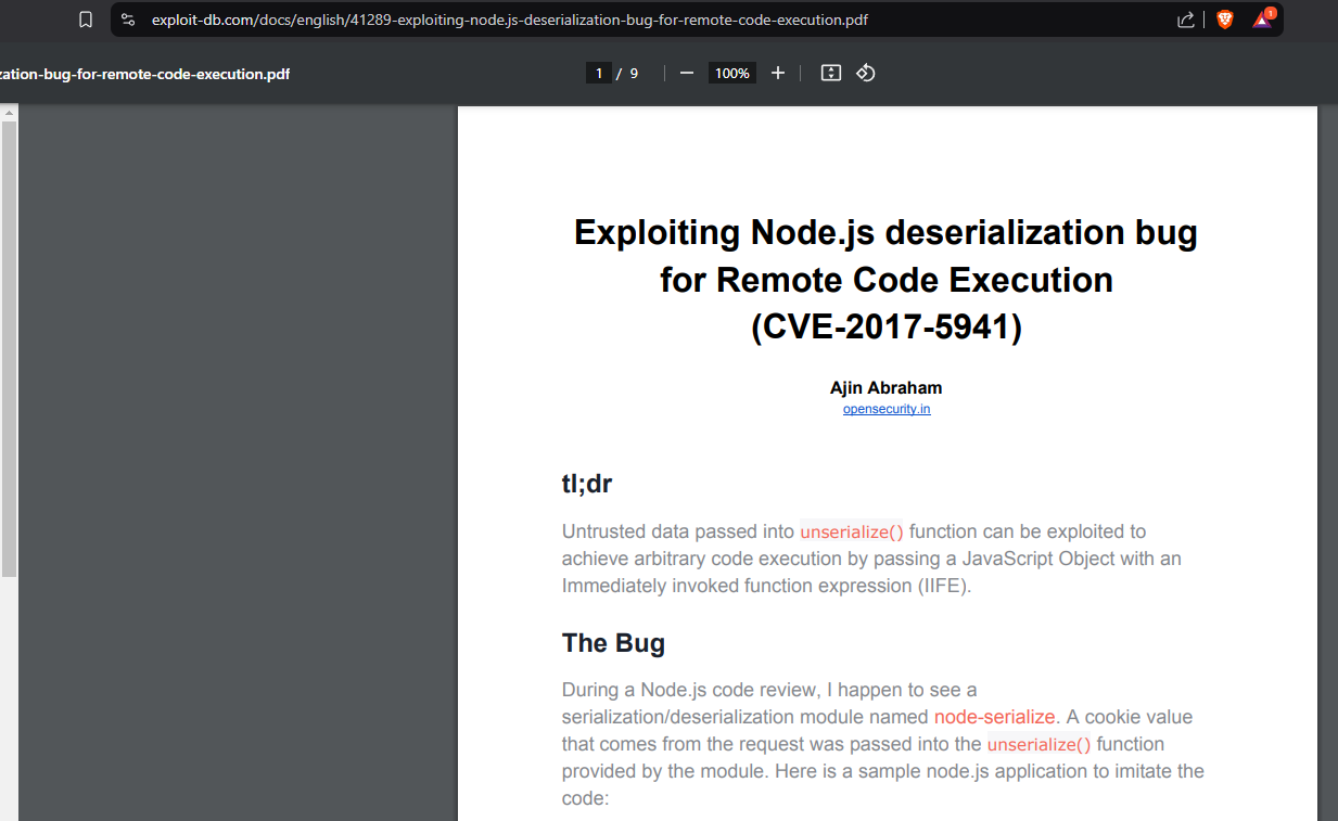 Exploited NodeJS deserialization vulnerability