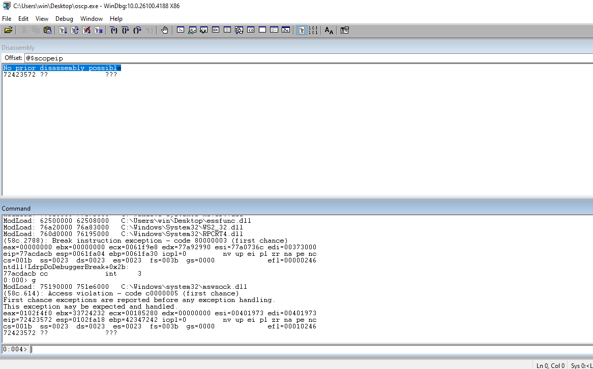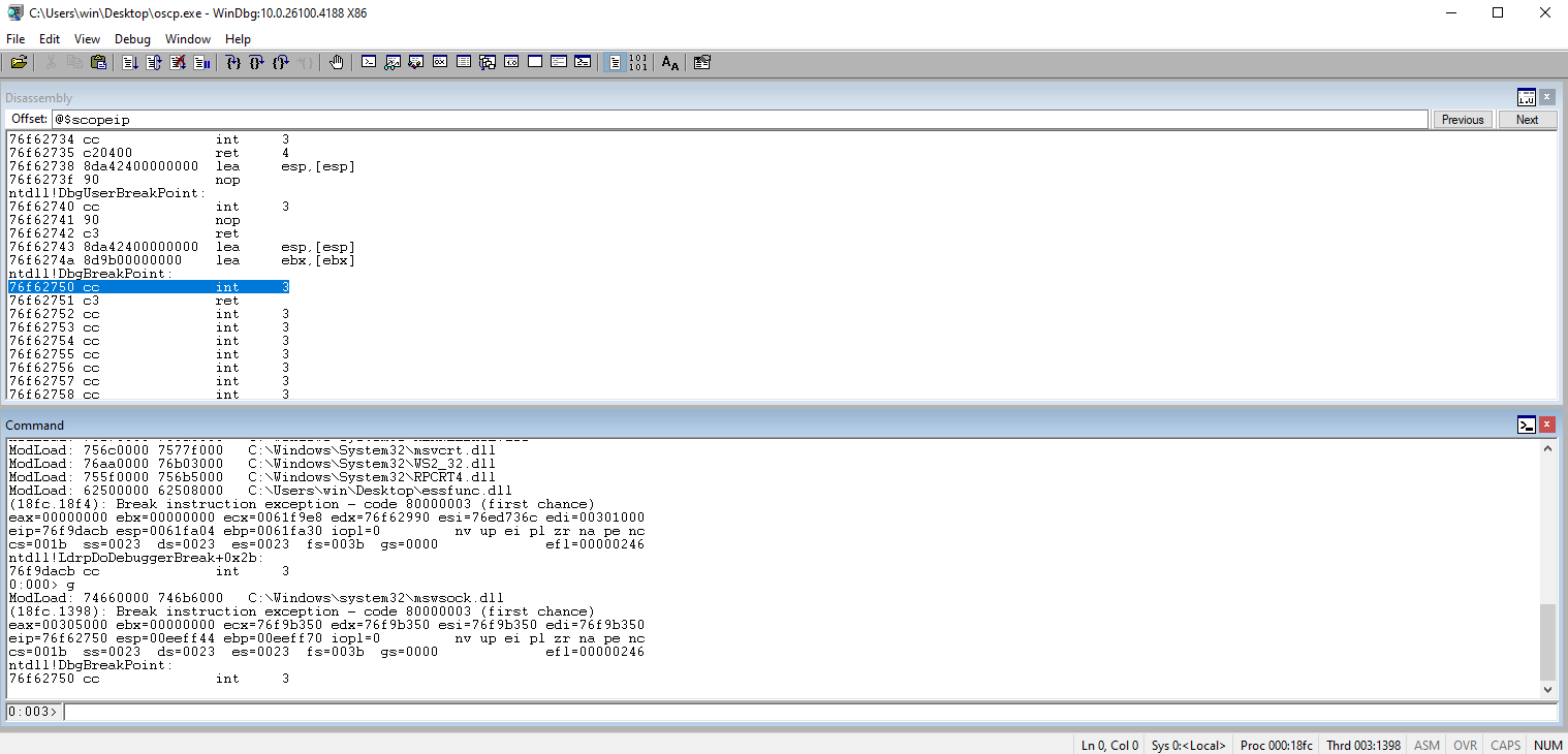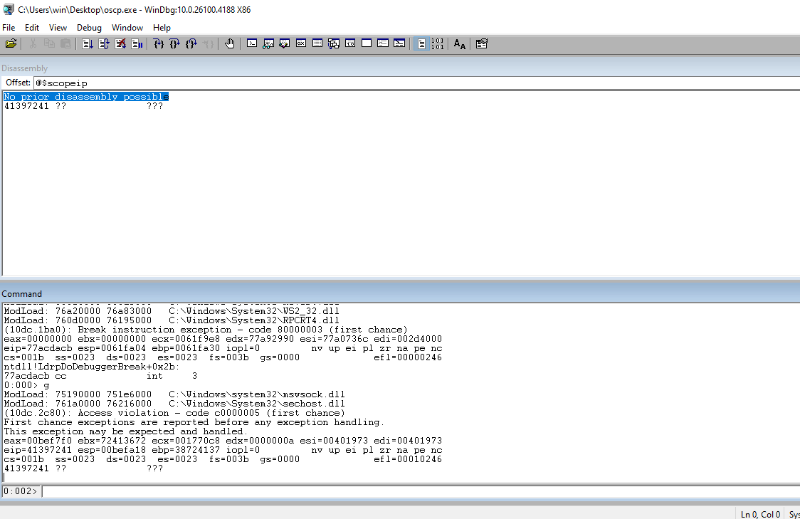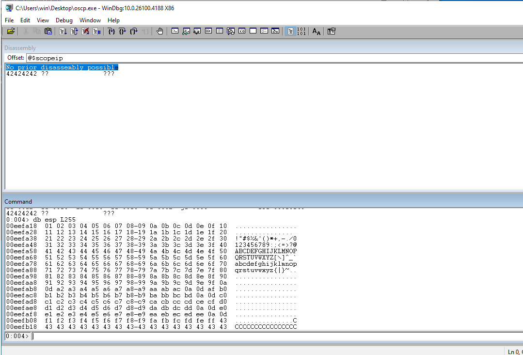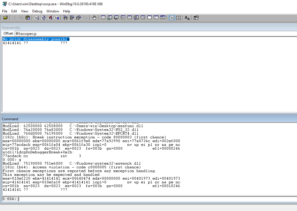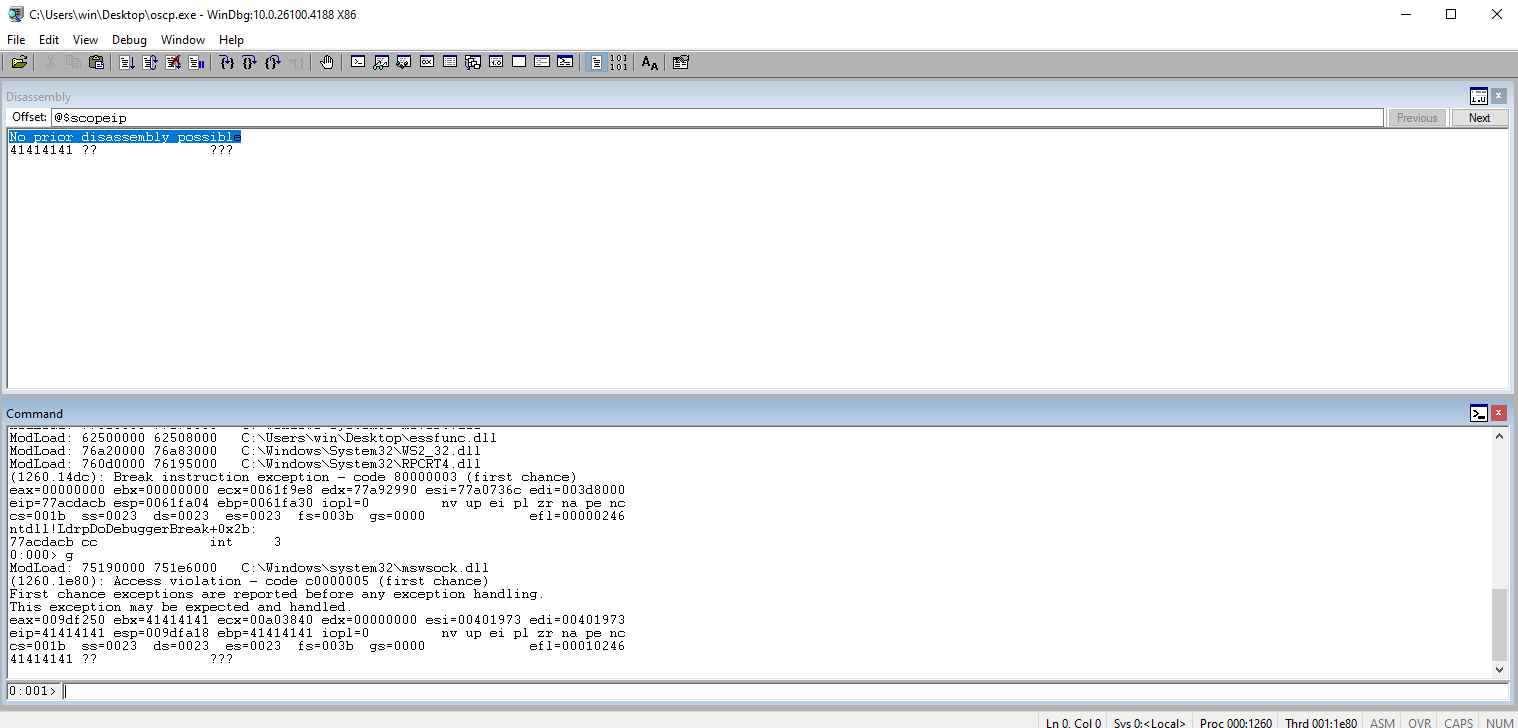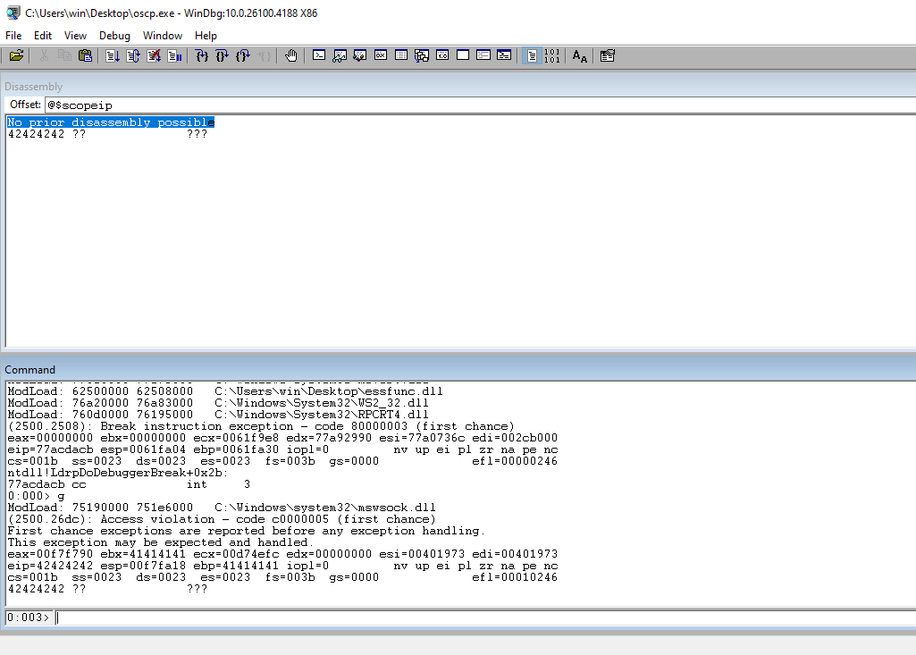 Update the code to hardcode the breakpoint and add 400 the attack string to make room for the payload. Run the code again and check EIP. Sometimes, when you change the size, you change how the program functions. We need to confirm that we still have EIP.