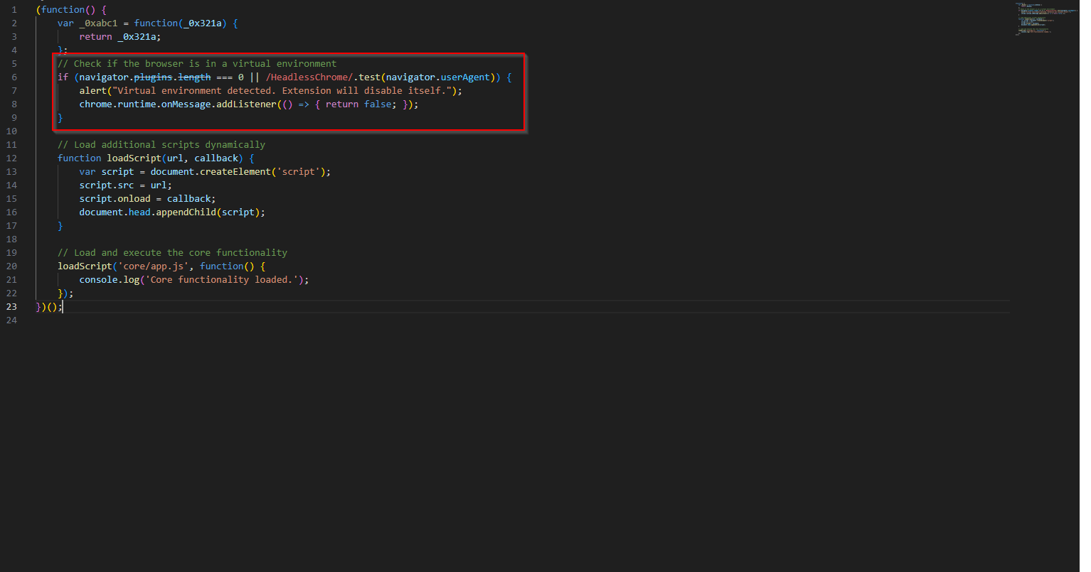 Deactivation conditions are also important when analyzing malware. Let us check for a trigger to the deactivation. We will try the loader.js because loaders sometimes have the deloader too. And there is the check for the length check.