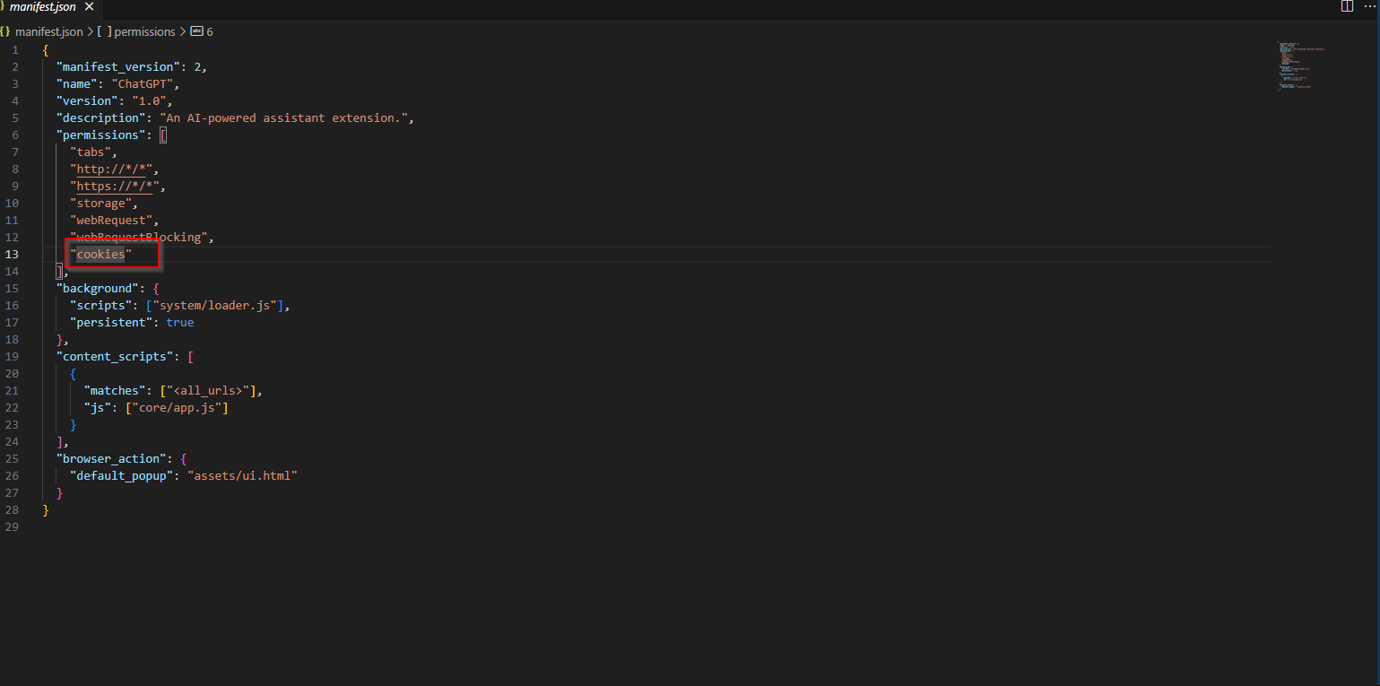 Last Question. This asks us about asking manipulating session and authentication. Well that is usually handled by cookies. So, let’s check the manifest. Sure enough. We have cookie permissions.