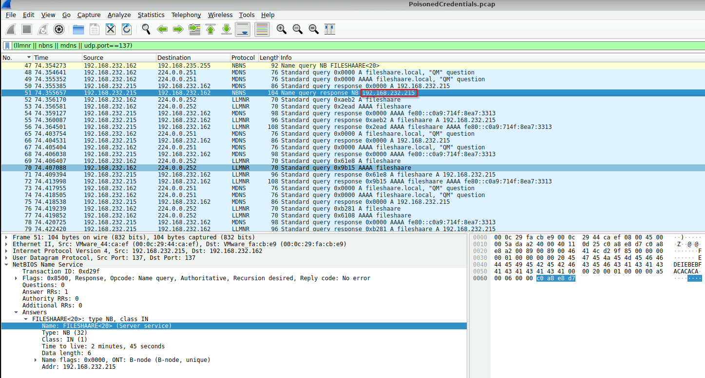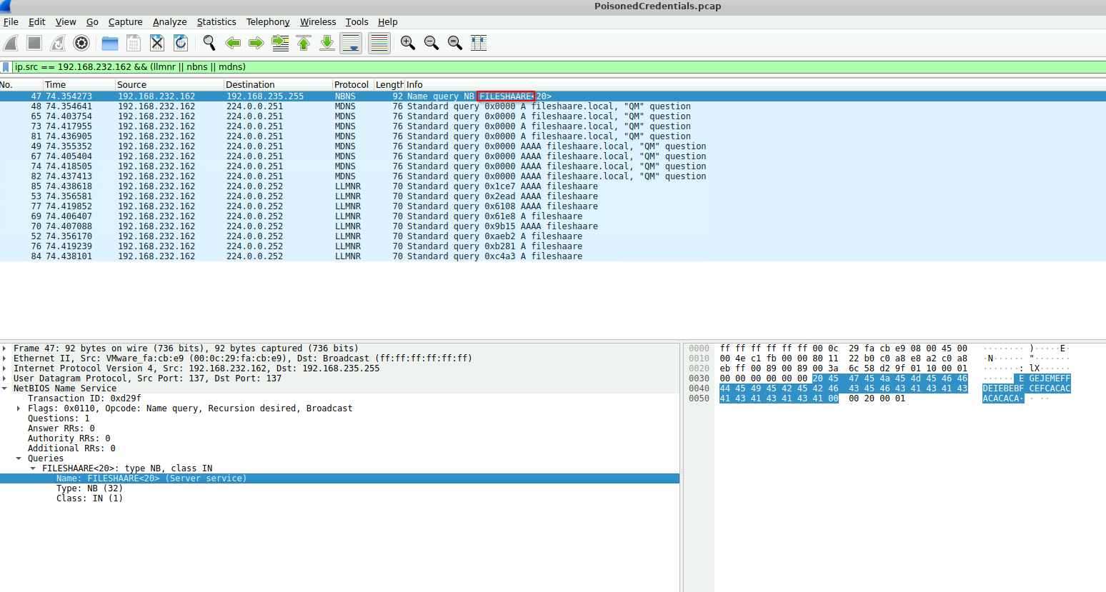Okay so the first thing that we had to do was spot a query that was mistype originating from 192.168.232.162. So, let’s set a filter for `ip.src == 192.168.232.162 && (llmnr || nbns || mdns), where it uses our source IP and the potential poisoned protocols. The typo should standout.