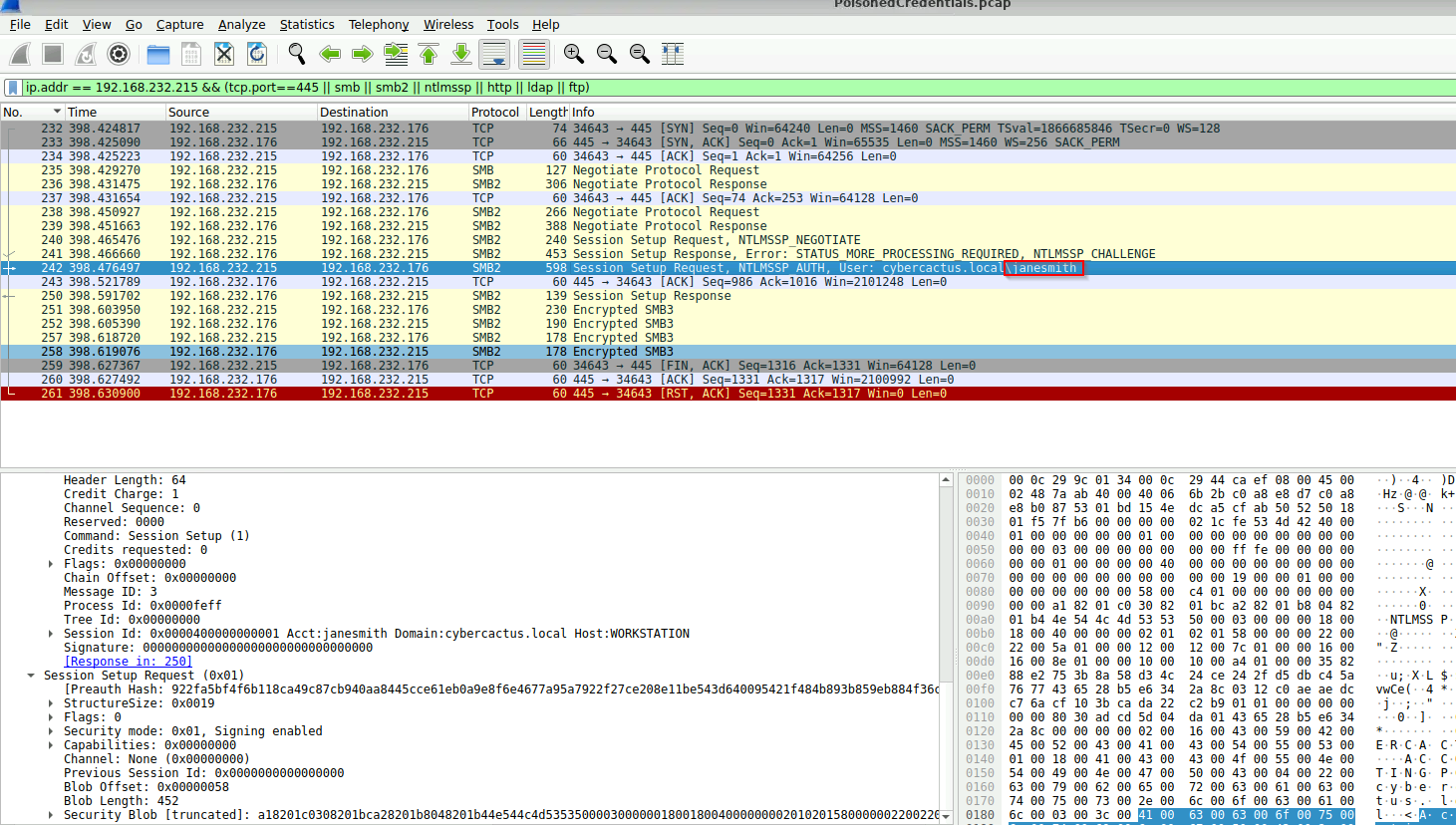 Scrolling through the traffic, if we filter for the rouge IP and smb protocol, we should be able to identify an auth request and get the user name.