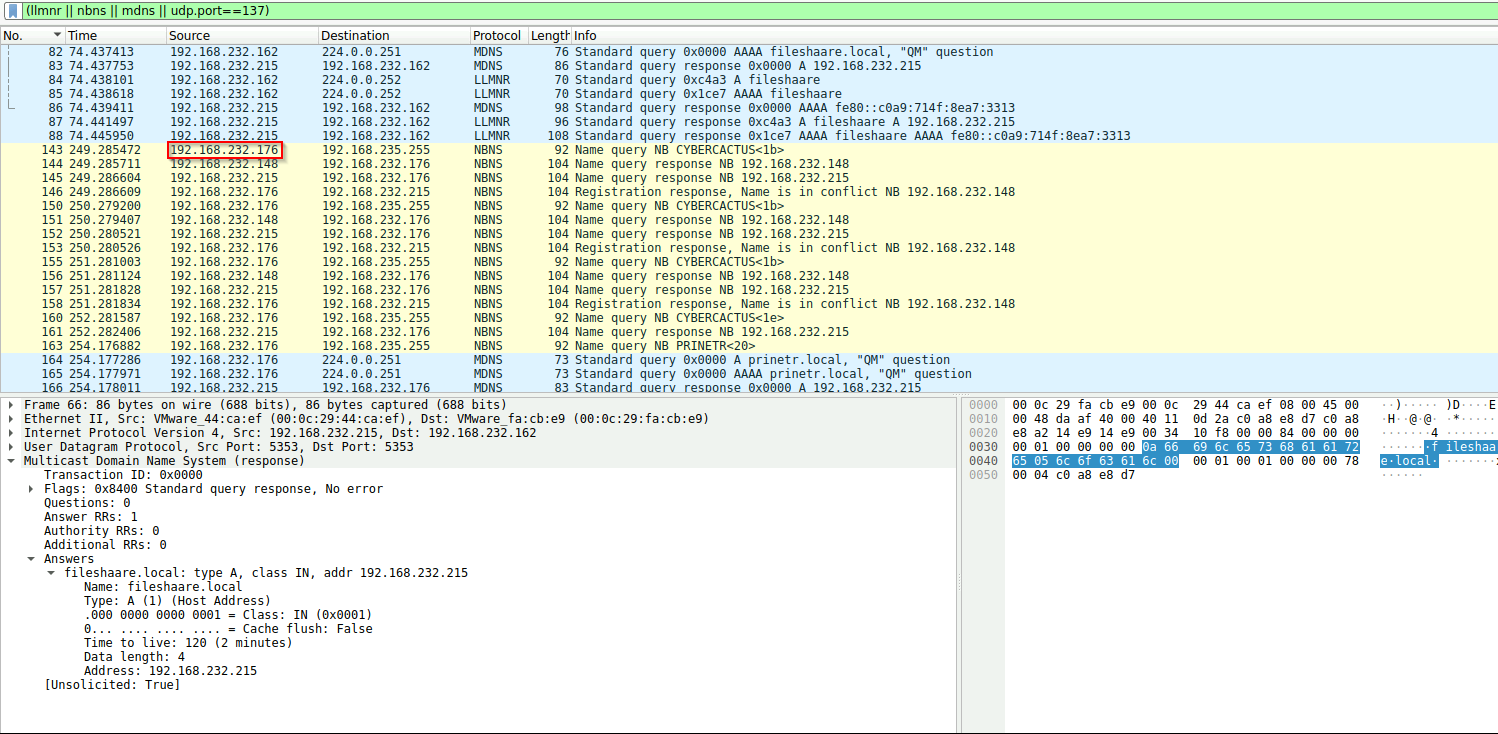 Next thing we have to identify is the rogue machine in the system. So, shortly after the Name query request, we should see the Name query response giving up the rouge IP.