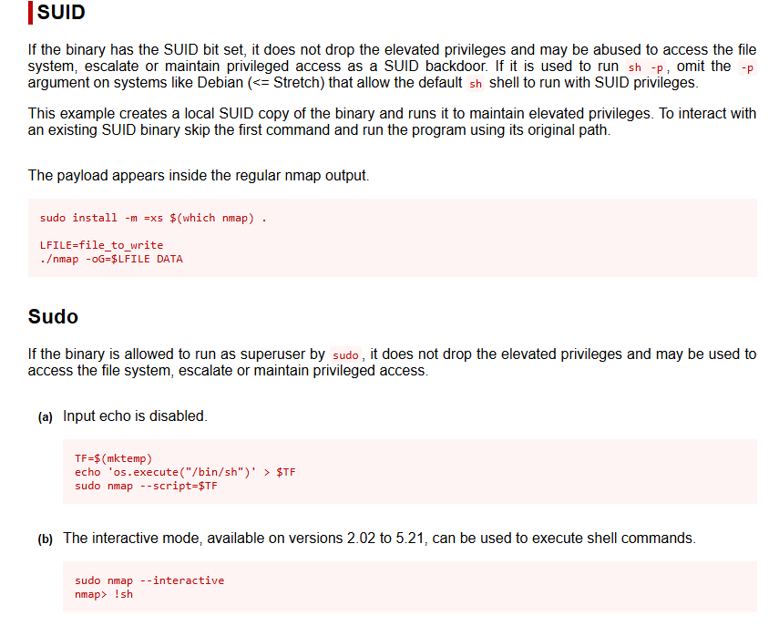 Lookup the GTFOBins for nmap to get a sense of how we can abuse it.