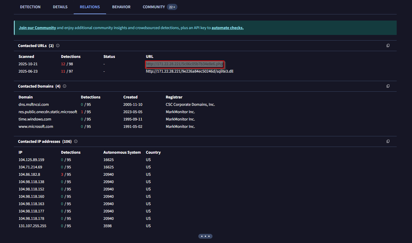 If we review the Contacted URLs, we can the URL of the C2 server.