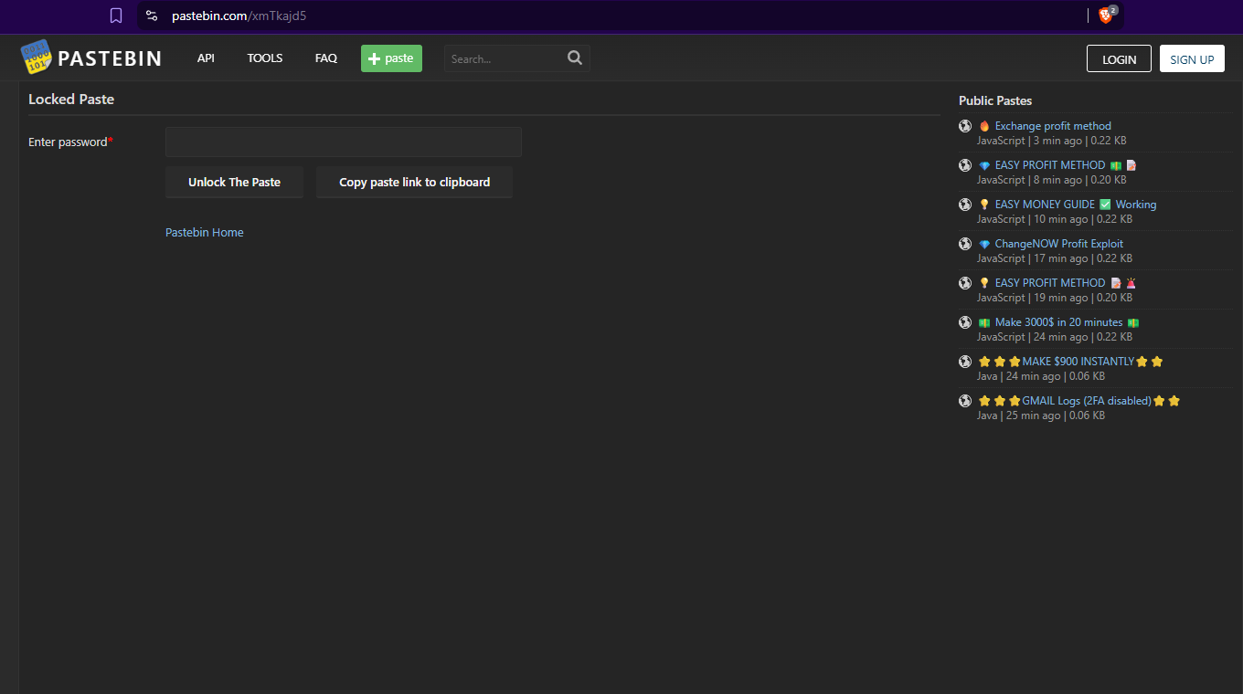 Navigating to the pastebin in the note, reveals a promp for a password.