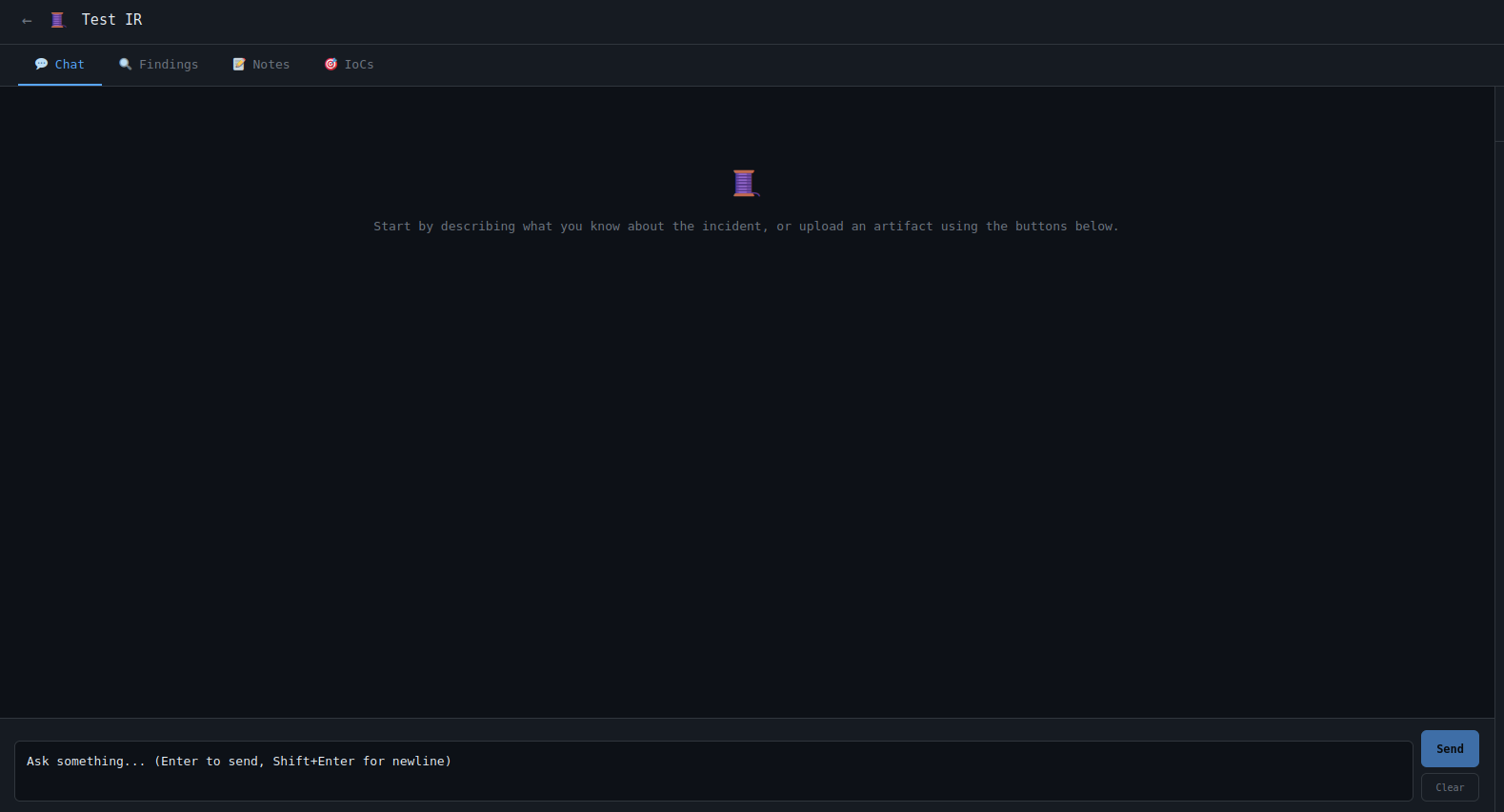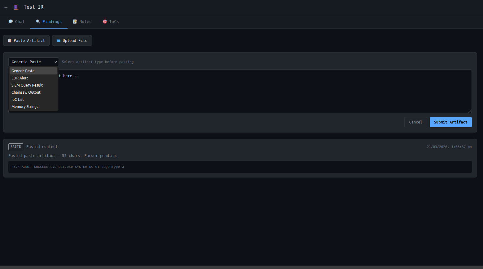 The ingestion interface accepts pasted artifacts from common incident response workflows. Logs, alerts, extracted strings, query results, and other evidence can be submitted directly into the case where they are normalized and folded into the broader investigation context.