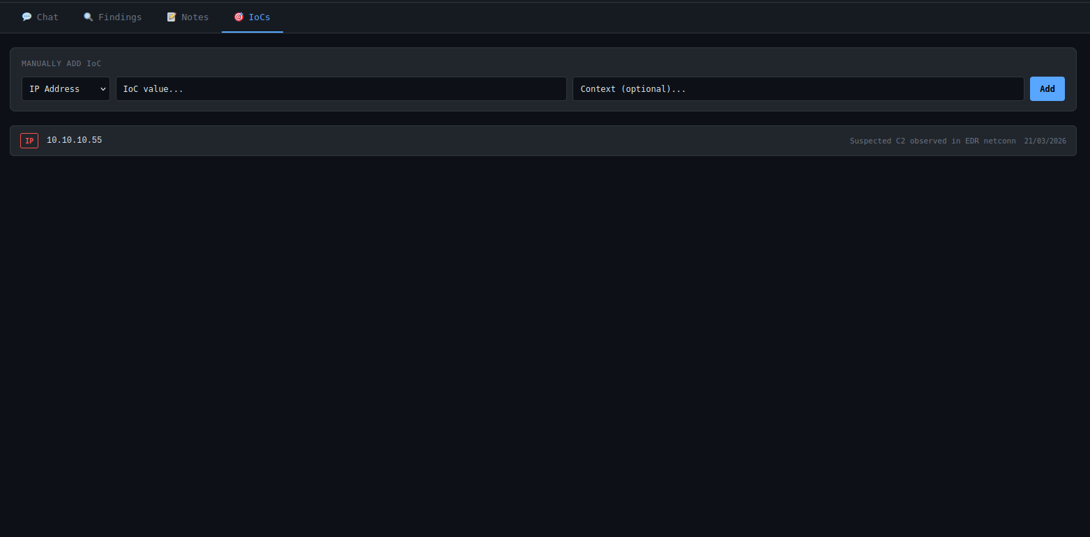 Each investigation has a dedicated workspace where evidence, notes, tracked indicators, and prior outputs remain attached to the case. The embedded chat interface allows analysts to query the investigation directly, refine hypotheses, and request targeted analysis.