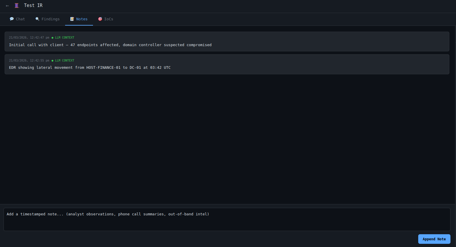 Not every useful signal comes from a parser. Freeform notes allow analysts to preserve reasoning, observations, side-channel findings, and contextual details that would otherwise remain outside the system.
