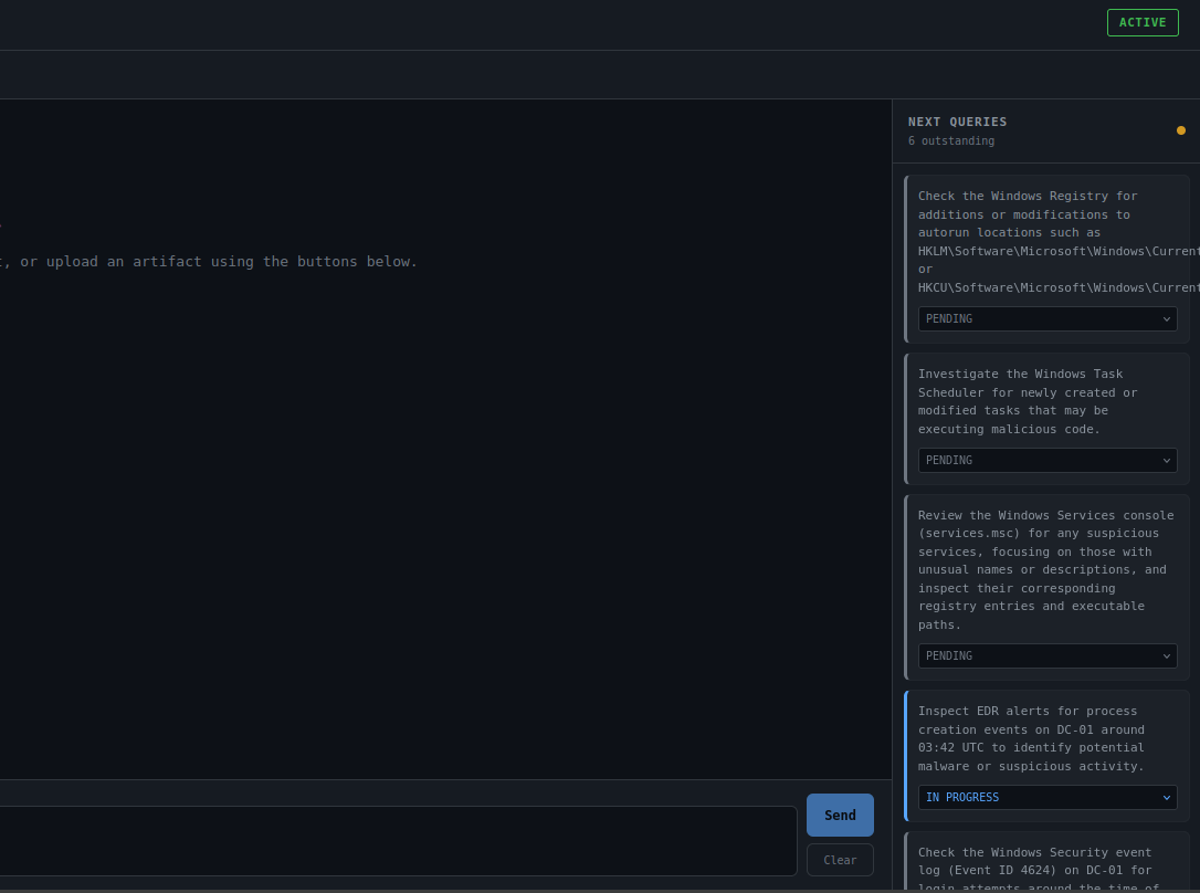 Prior findings, generated tasks, hypotheses, and completed actions are persisted back into the case context. This reduces repetitive outputs, preserves momentum between sessions, and allows the investigation to progress cumulatively instead of restarting each time.